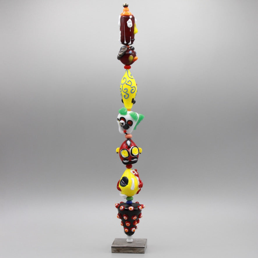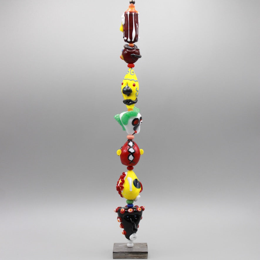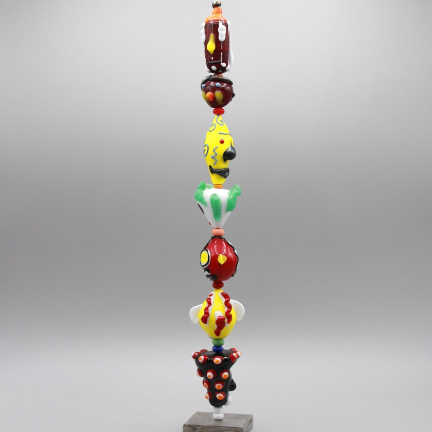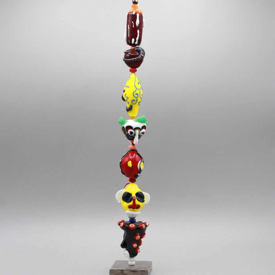 Personnages passeports africains,représentés par des masques traditionnels faits habituellement en argile et ici, créés en verre sur mandrin de 30 cm environ de hauteur composé d'une farandole de têtes en verre de Murano multicolore pour inviter l'esprit par le regard, à voyager symboliquement et instantanément d'un continent à l'autre avec ou sans passeport ..... l'art tribal ou primitif n'a pas de frontière qu'artistique pour réunir tous les chemins du possible, que tente de rassembler ici ce totem initiatique !