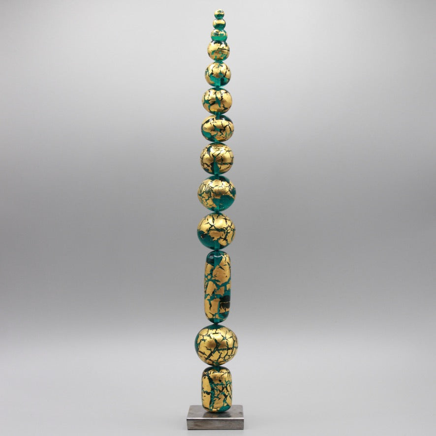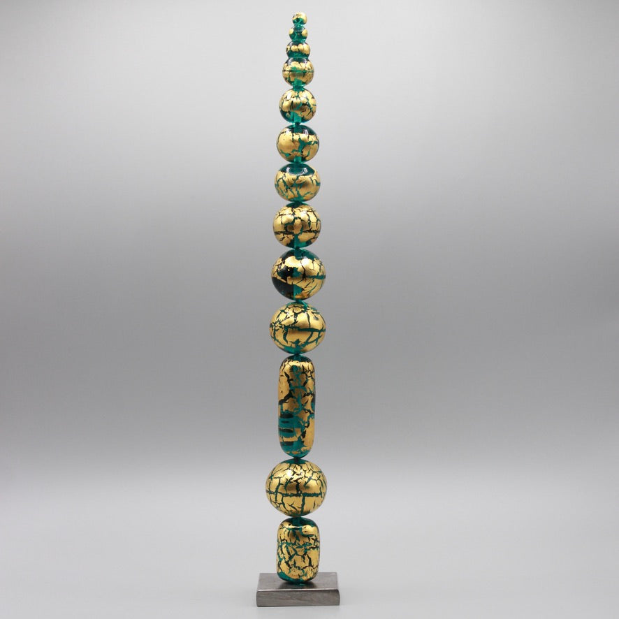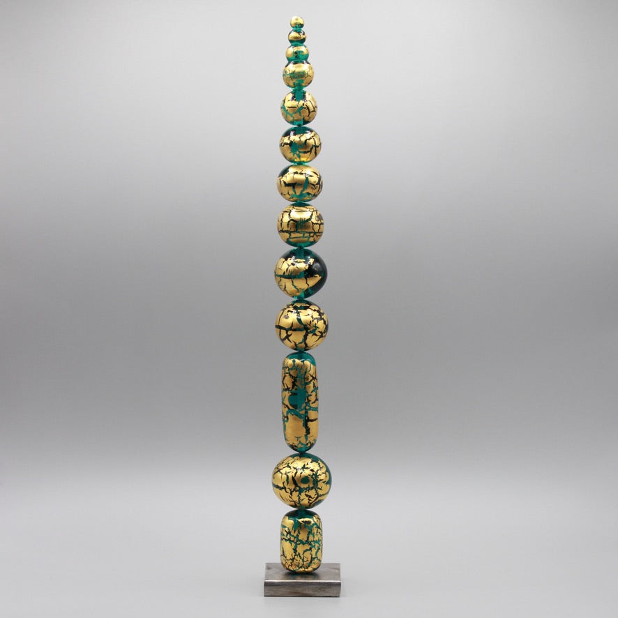 Motif abstrait sur mandrin de 30 cm de hauteur composé d'une farandole de perles en verre de Murano rehaussées à la feuille d'or, pour signifier autant de reflets que de couleurs détonantes issues des forêts alluviales situées en bordure des gaves pyrénéens