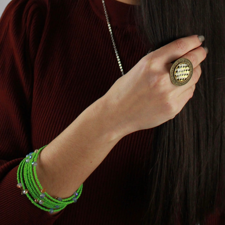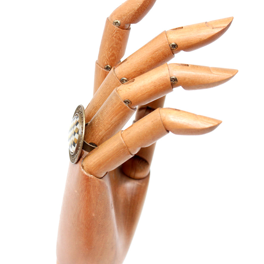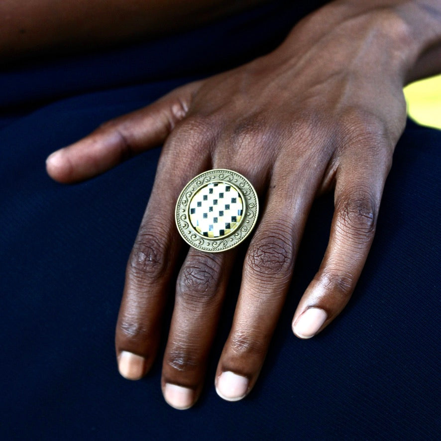 Bague ronde cabochon bombé en résine au motif graphique d'un damier