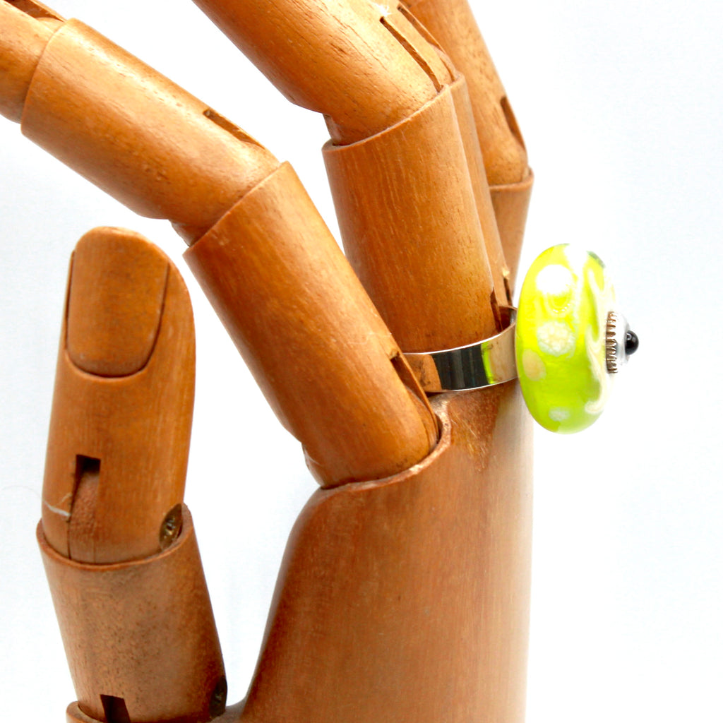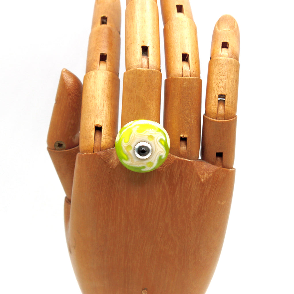 Bague fantaisie ARTISANALE avec cabochon rond en verre de Murano motif abstrait vert acide et ivoire de 20 mm sur un support en métal argenté ajustable à votre doigt avec petit cabochon en Murano au centre.