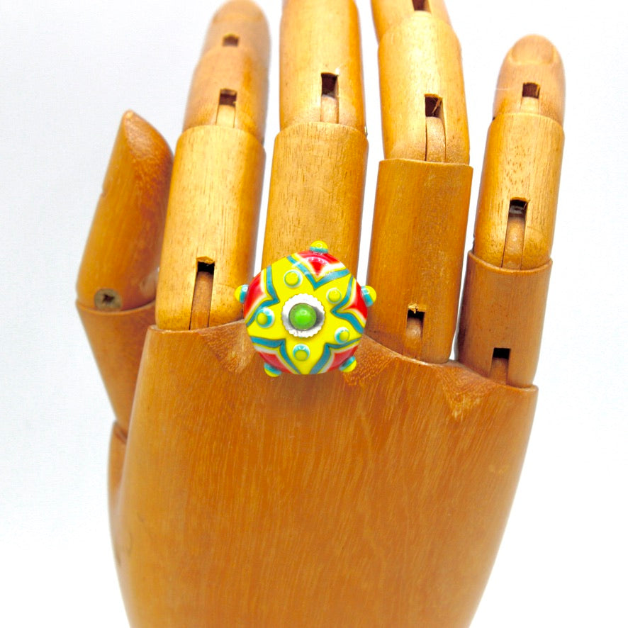 Bague fantaisie ARTISANALE avec cabochon rond en verre de Murano forme ronde à picots multicolores de 20 mm sur un support en métal argenté ajustable à votre doigt avec cabochon vert en Murano au centre.