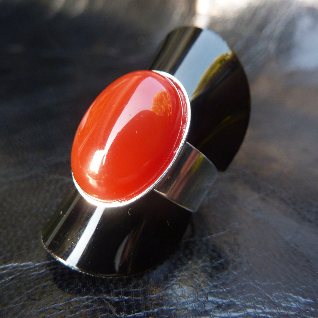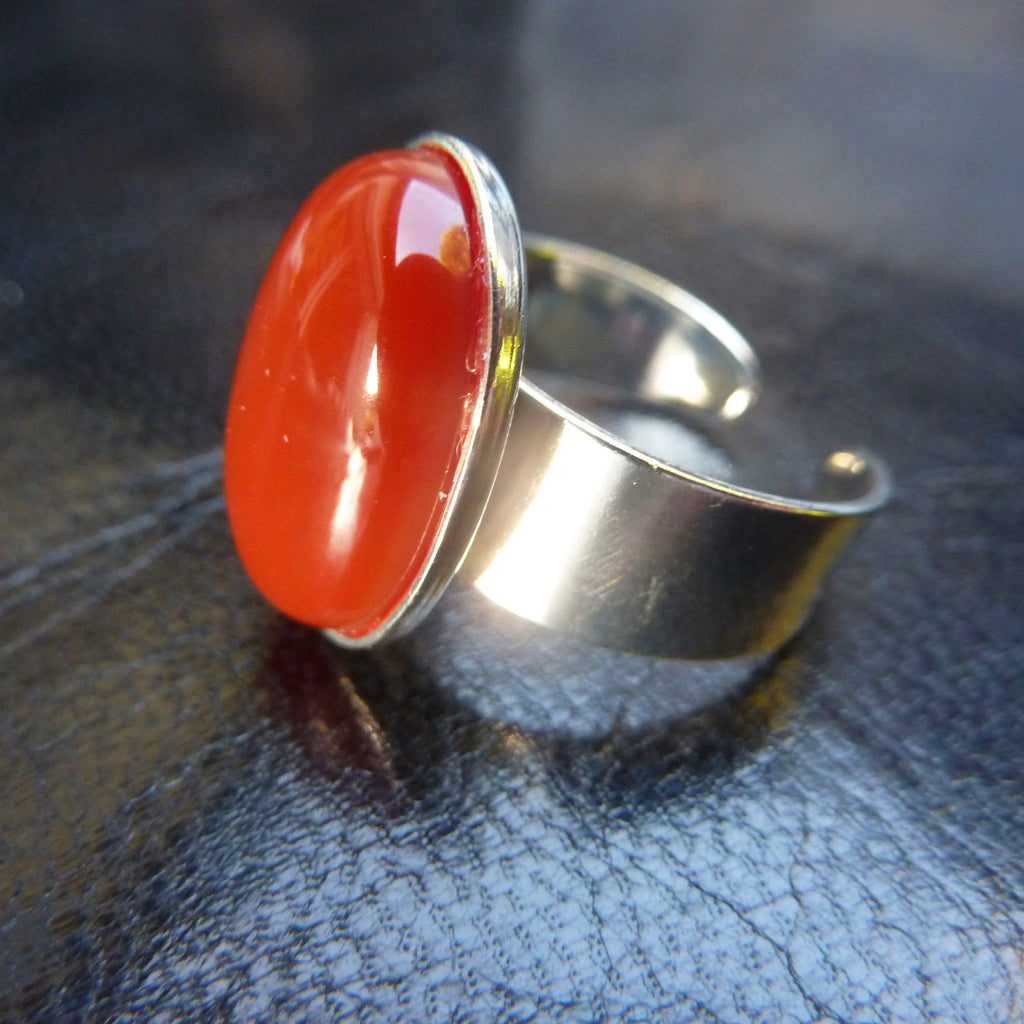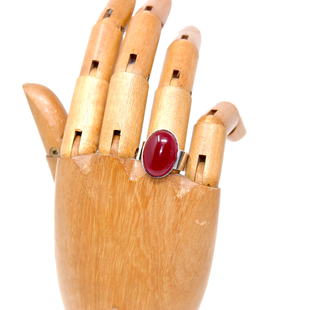 Bague fantaisie ARTISANALE avec cabochon en pierre minérale semi-précieuse Jade Rose Framboise de 18X13 mm sertie sur un support ajustable finition argent 925.
