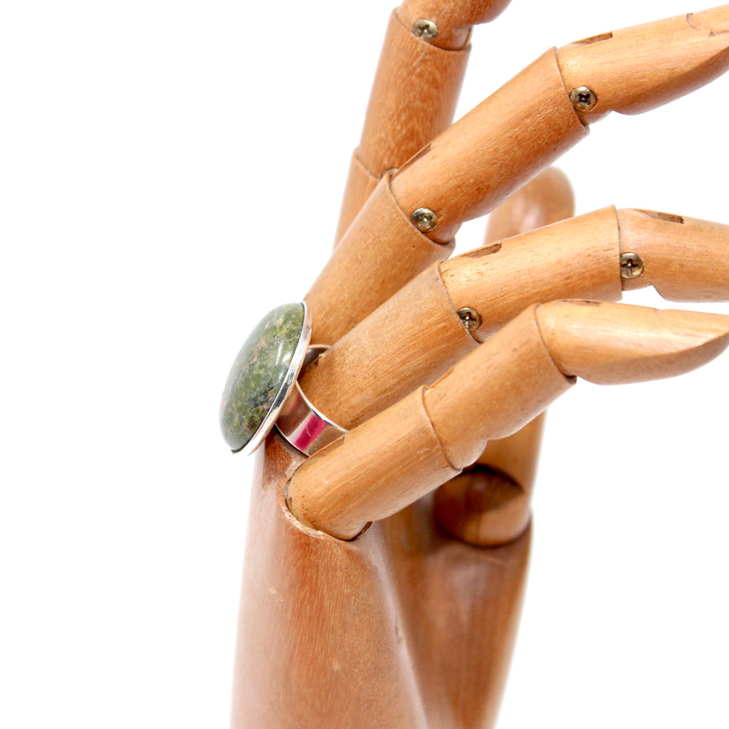 Bague fantaisie ARTISANALE avec cabochon grand modèle en pierre minérale semi-précieuse Unakite