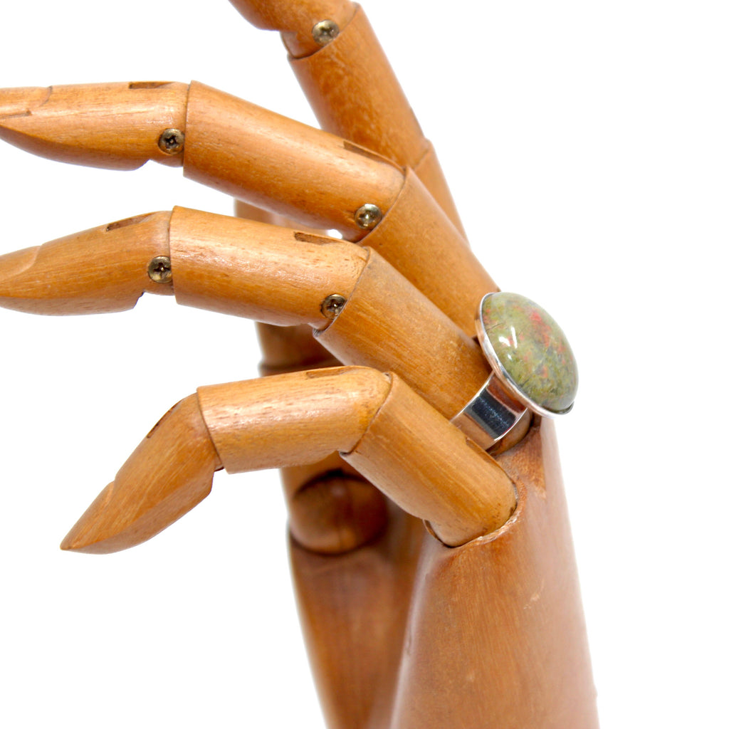 Bague fantaisie ARTISANALE avec cabochon en pierre minérale semi-précieuse Unakite d'une couleur vert sombre