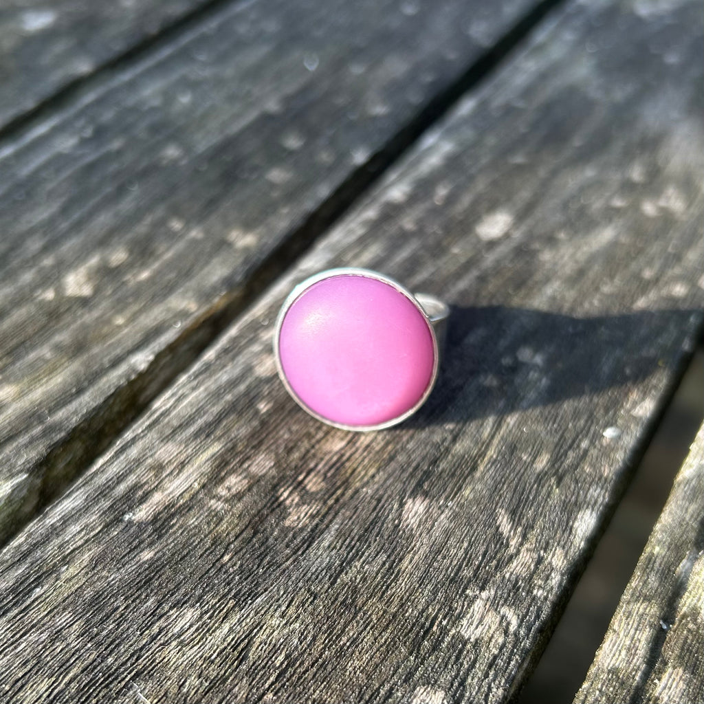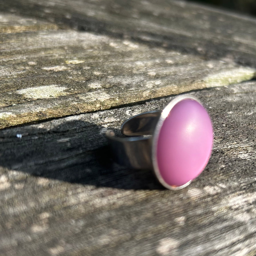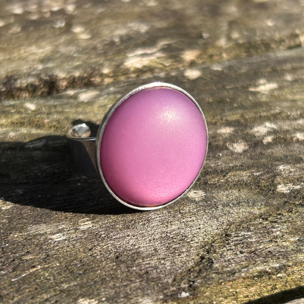 Bague fantaisie ARTISANALE avec cabochon de 20 mm en résine Polaris mat et légèrement givré serti sur un support en métal plaqué argent 925 ajustable à votre doigt
