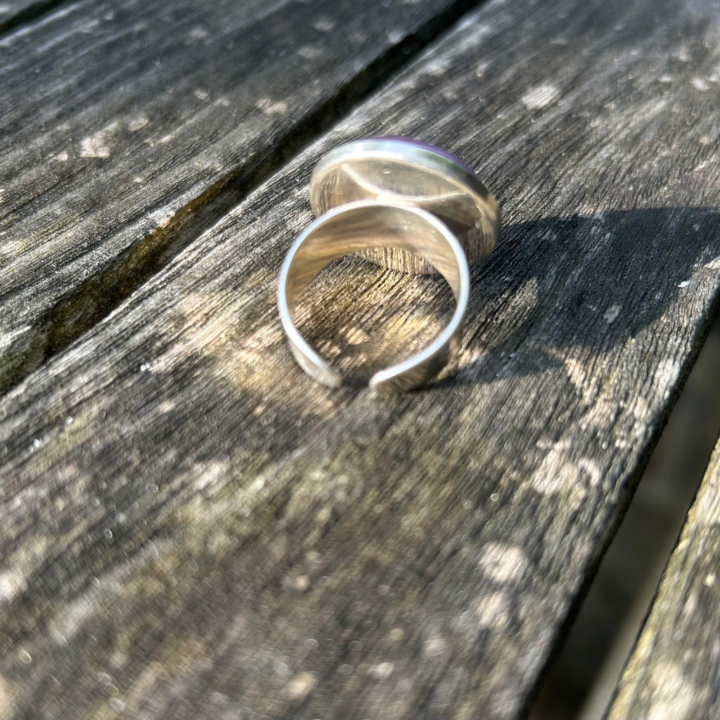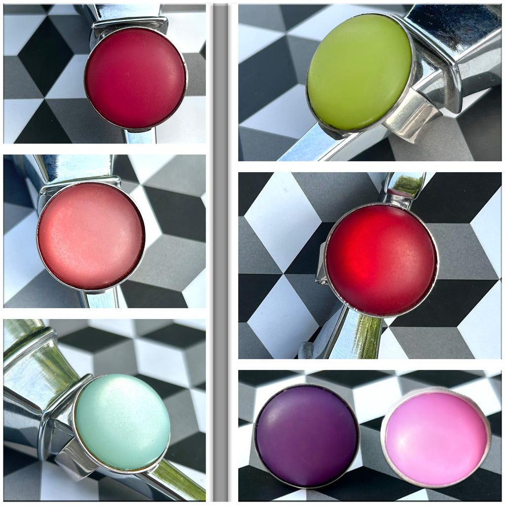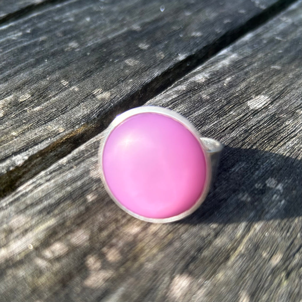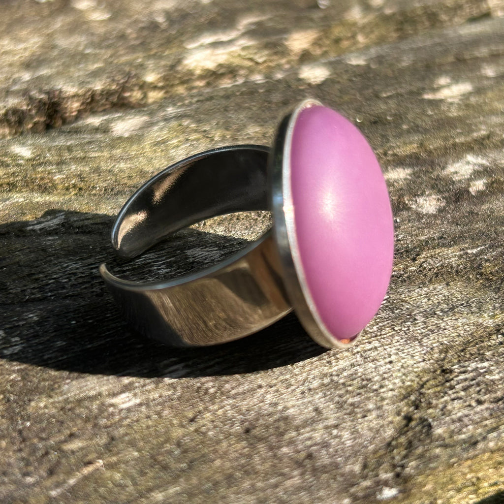 Bague fantaisie ARTISANALE avec cabochon de 20 mm en résine Polaris mat et légèrement givré serti sur un support en métal plaqué argent 925 ajustable à votre doigt