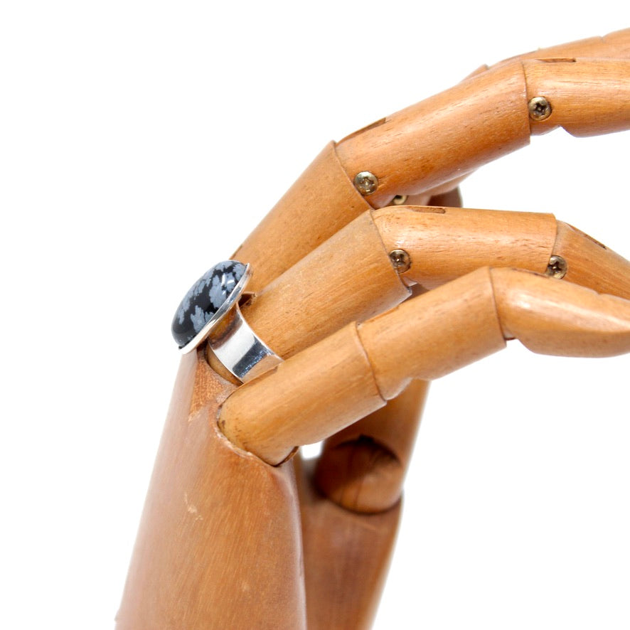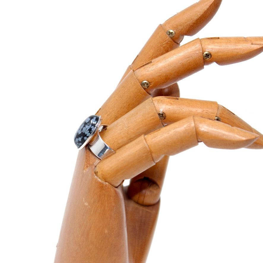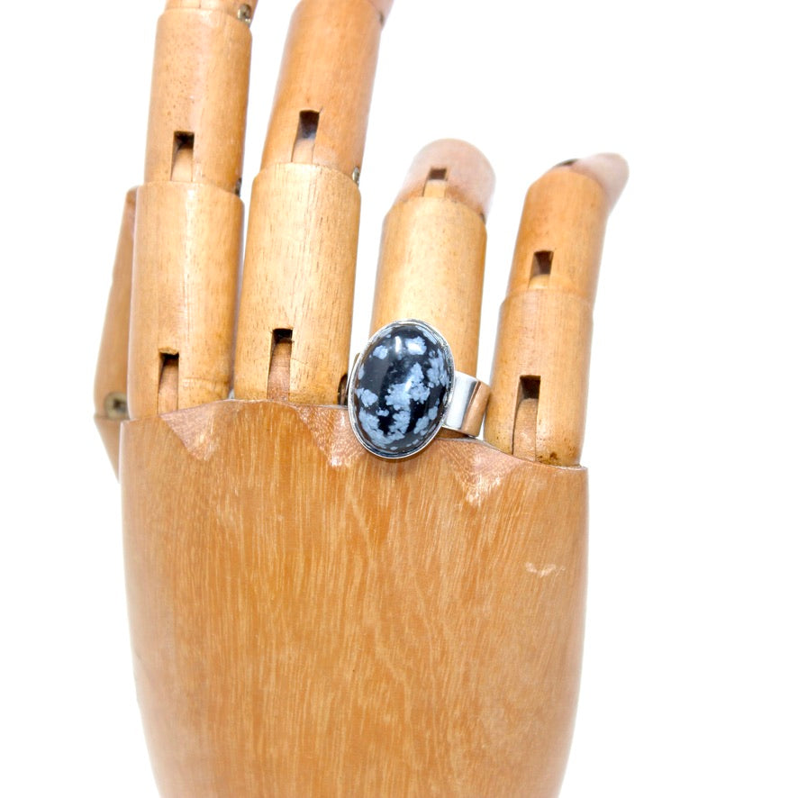 Bague fantaisie ARTISANALE avec cabochon en pierre minérale semi-précieuse Obsidienne Mouchetée de 18X13 mm sertie sur un support ajustable finition argent 925
