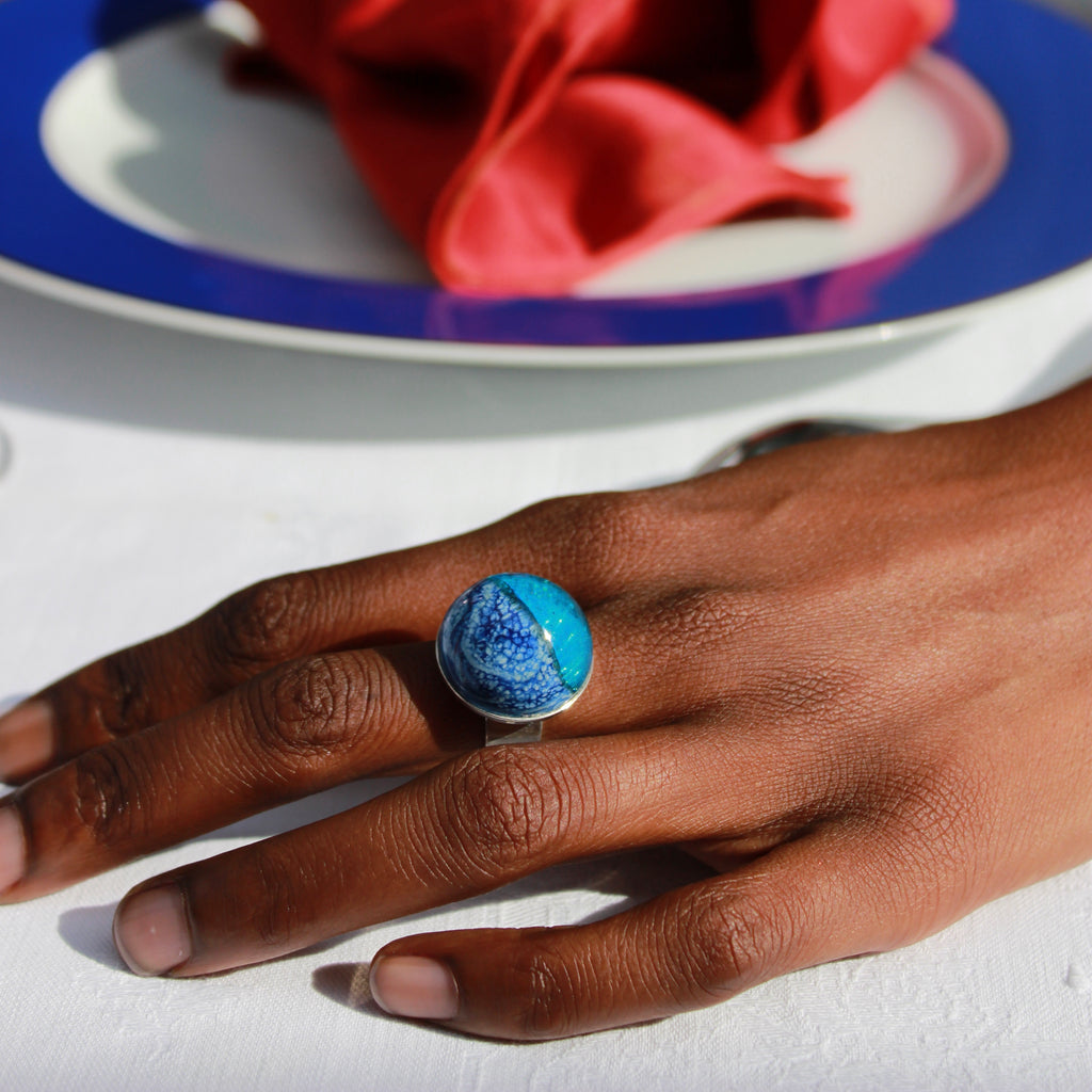 Bague fantaisie ARTISANALE avec cabochon en verre de Murano de deux teintes bleutées entrelacées de 20 mm serti sur un support en métal plaqué argent 925 ajustable à votre doigt.