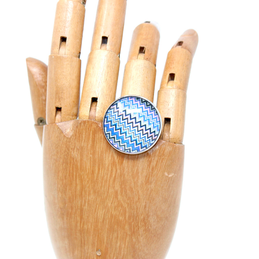 Bague ronde cabochon résine motif graphique rayures bleues en stries