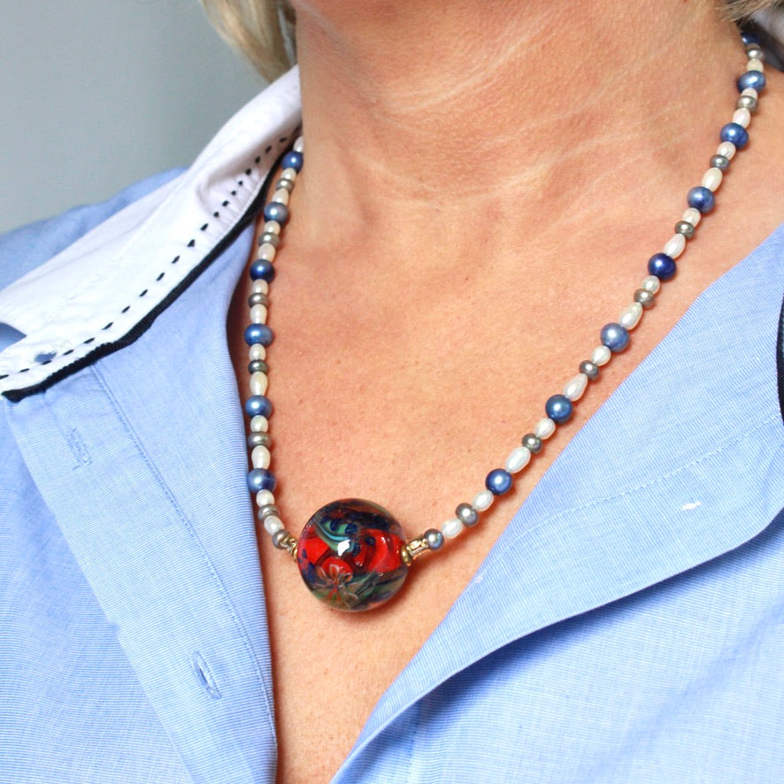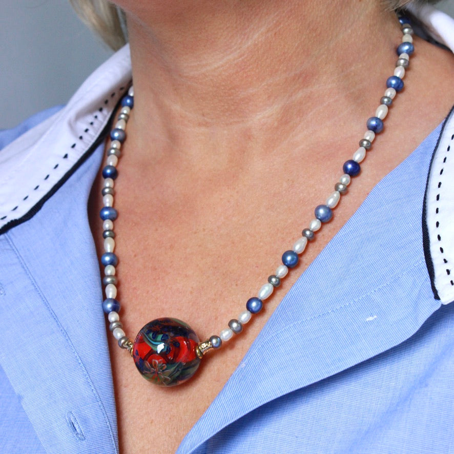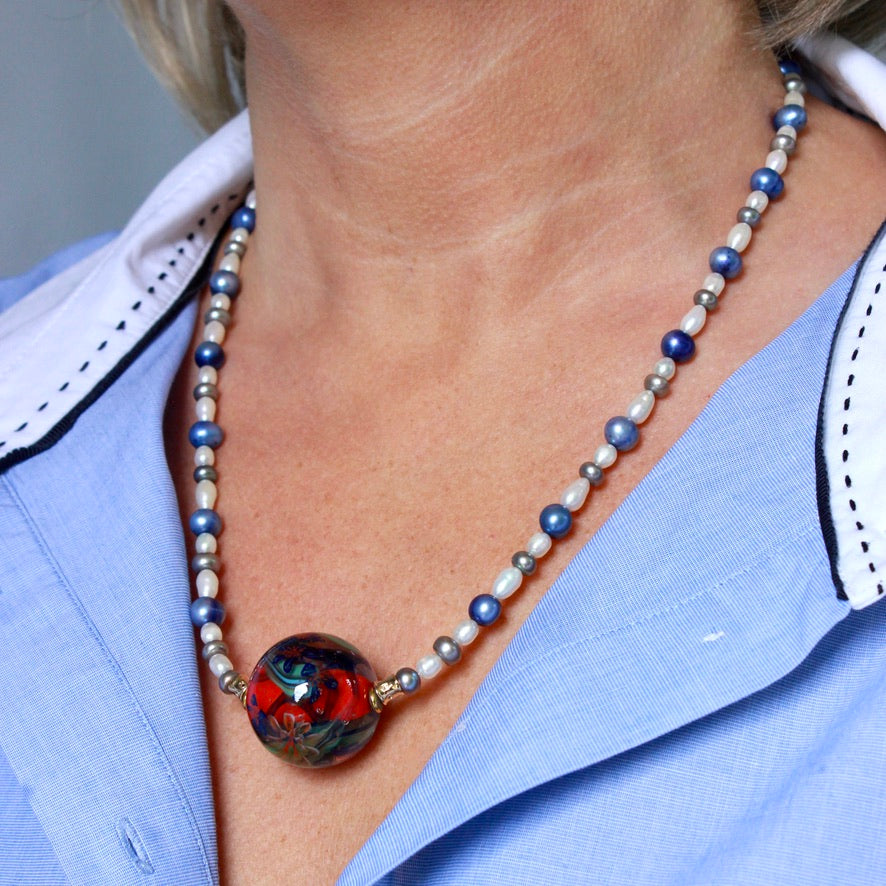Cette mini-collection Édition Limitée de colliers Murano est née de l'assemblage subtil et harmonieux de perles Murrines aux motifs floraux créées à la flamme par Pasc@l avec des perles côtières d'eau douce ; comme pour vous suggérer une ambiance magique de la Riviera: sublime et familière où l'air du temps est suspendu à un rêve d'ailleurs, qui se dissipe poétiquement aux confins du firmament !