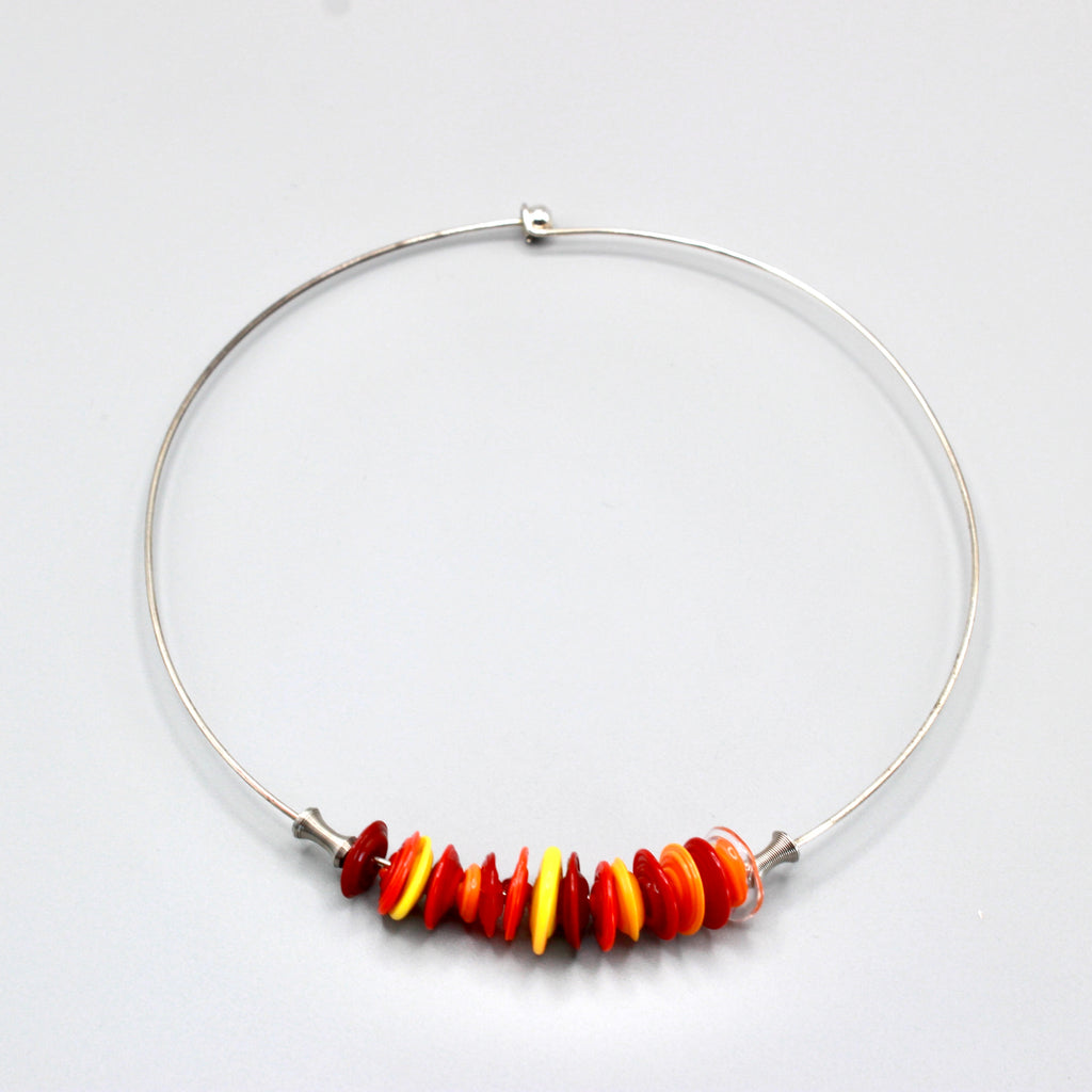 Farandole de disques en verre de Murano filé au chalumeau par Pasc@l le perlier d'art maison montée sur un ras de cou rigide en métal qui s'adaptera parfaitement et facilement à tous les tours de cou, en un clin d’œil joyeux.