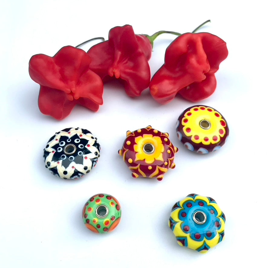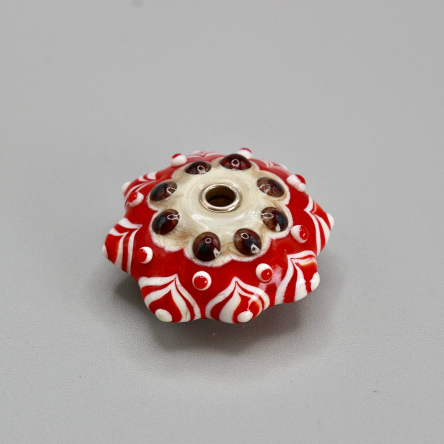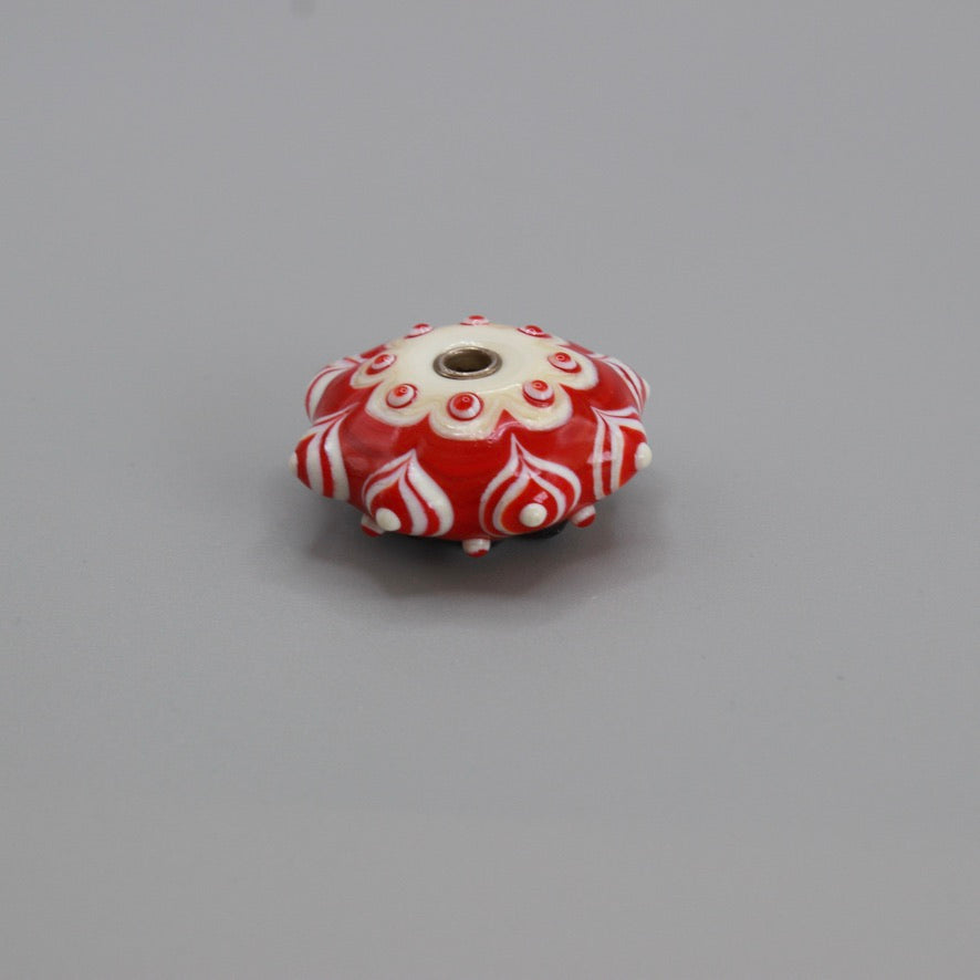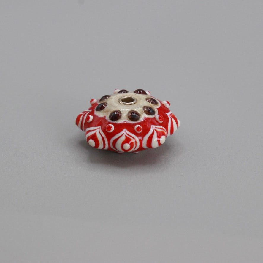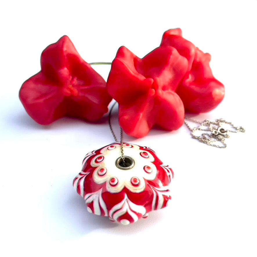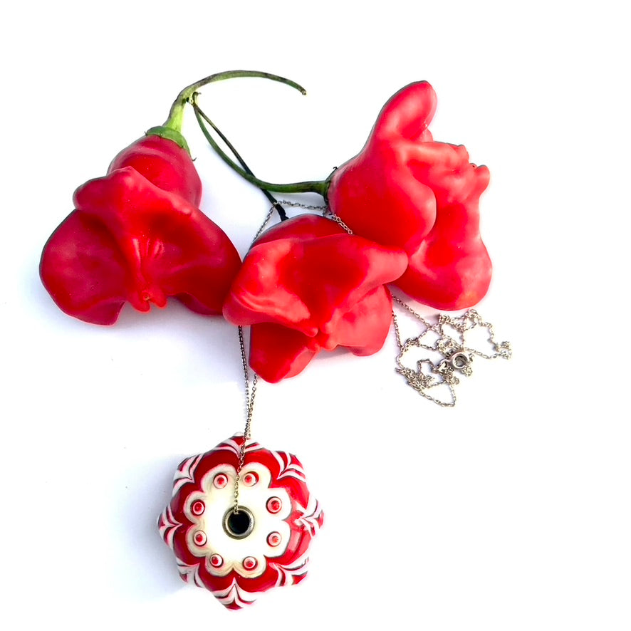 Pendentif forme lentille blanc ivoire saupoudrée d'une touche subtile de rouge à points plats et picots aussi sur la tranche, avec du noir au recto, pour un motif graphique épuré, trouée en son centre et rehaussé par deux œillets en argent 925 pour une perle en verre de Murano ronde un peu, beaucoup, passionnément maison filé au chalumeau aux couleurs multicolores et chatoyantes différentes au recto et au verso