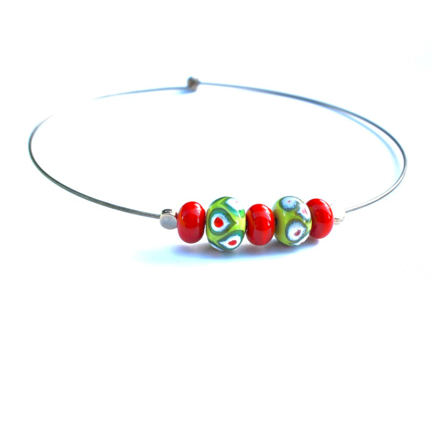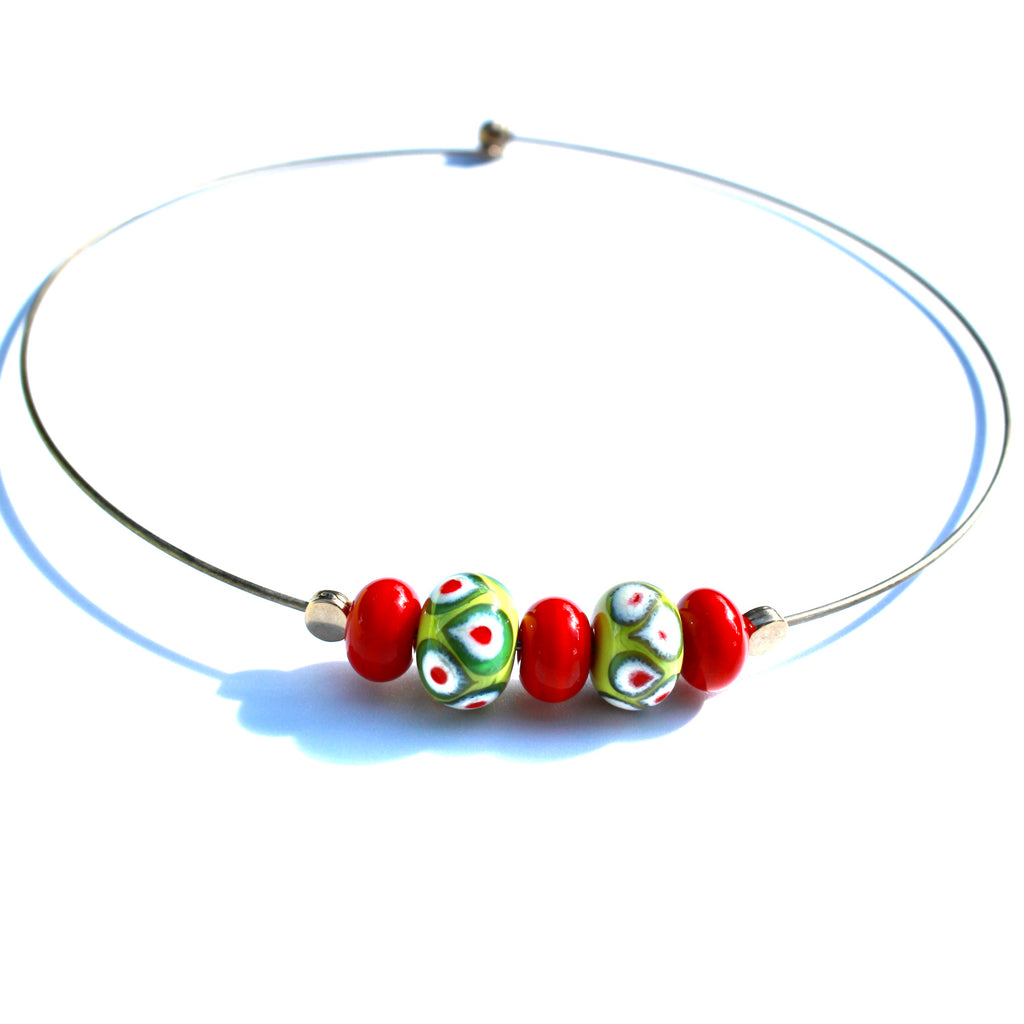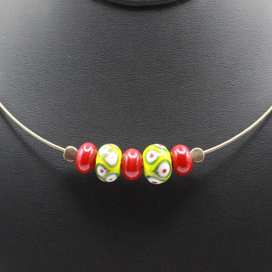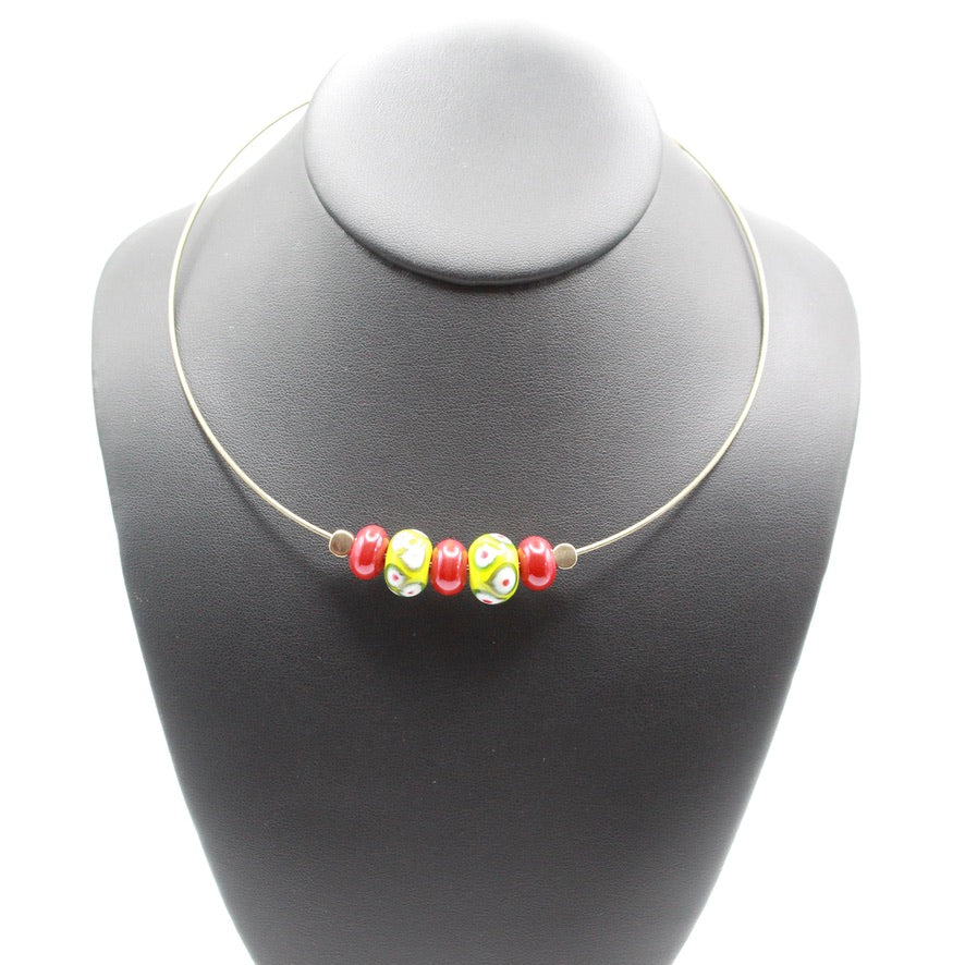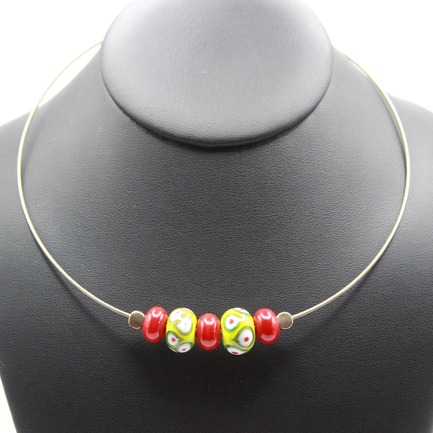 Collier en verre de Murano filé au chalumeau par Pasc@l le perlier d'art maison d'un un ras de cou semi-rigide en métal qui s'adaptera parfaitement et facilement à tous les tours de cou, en un clin d’œil joyeux.