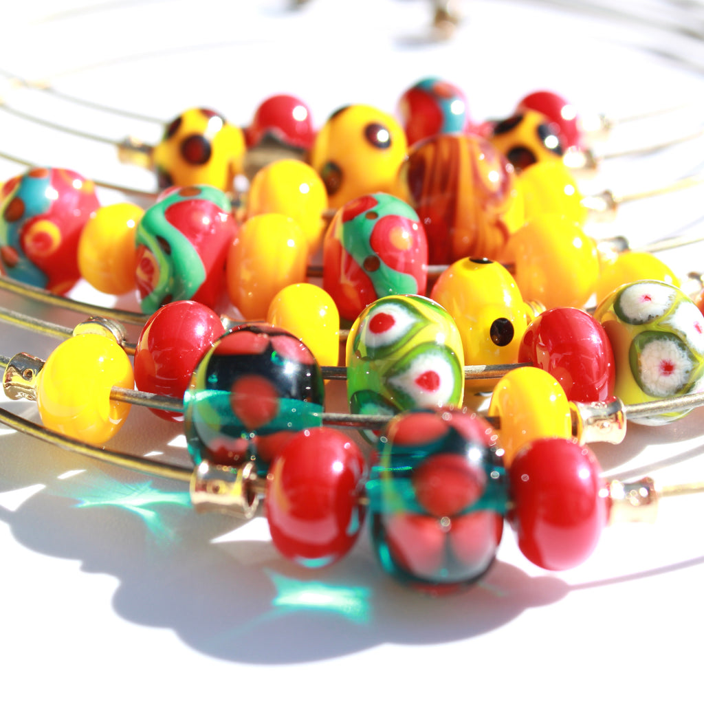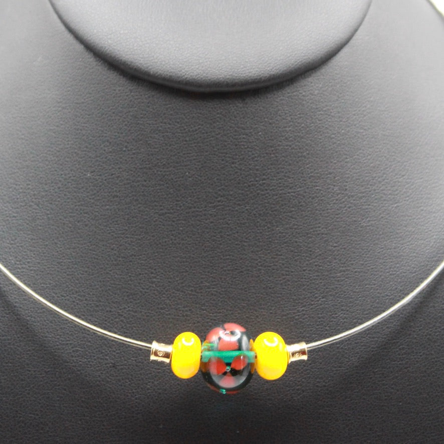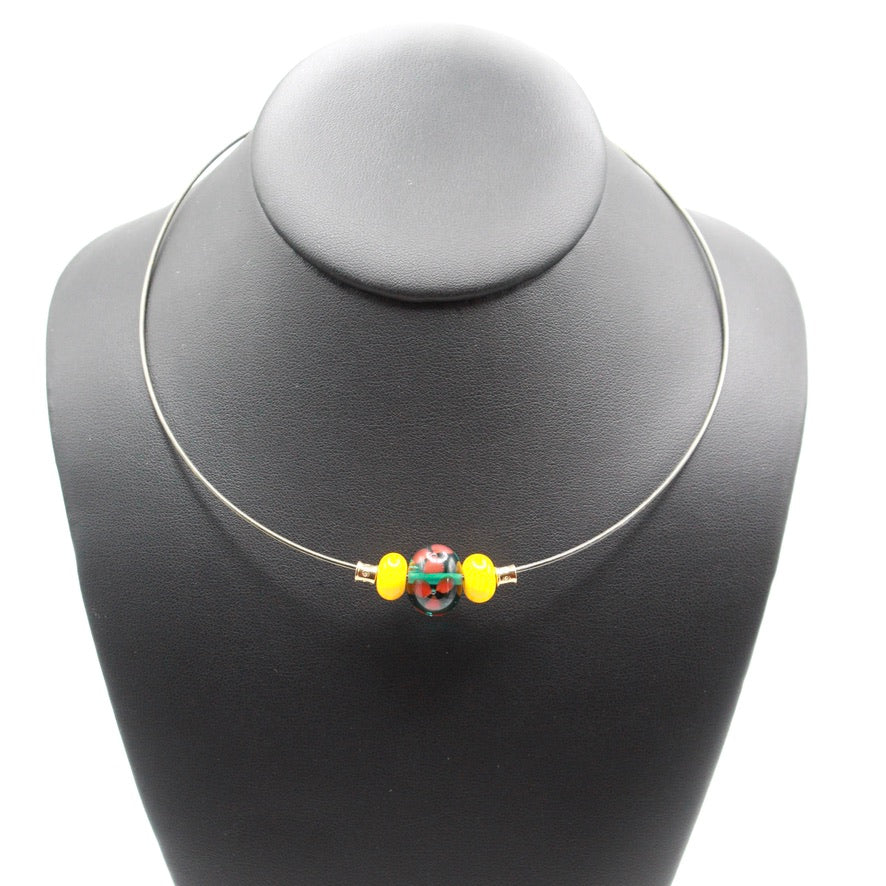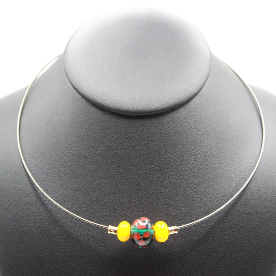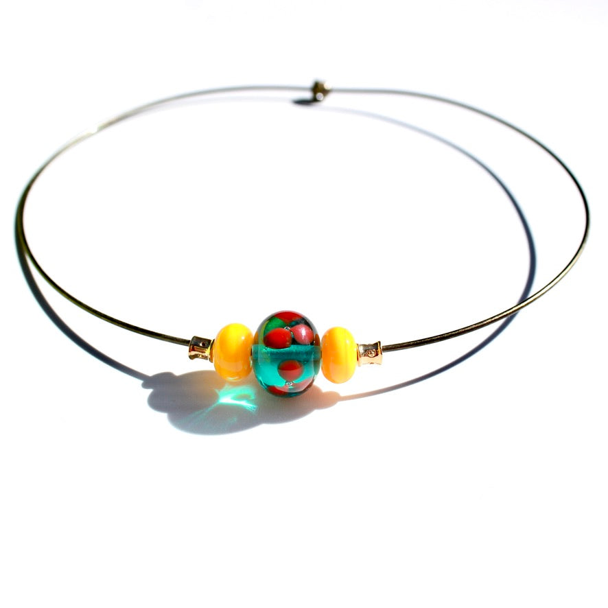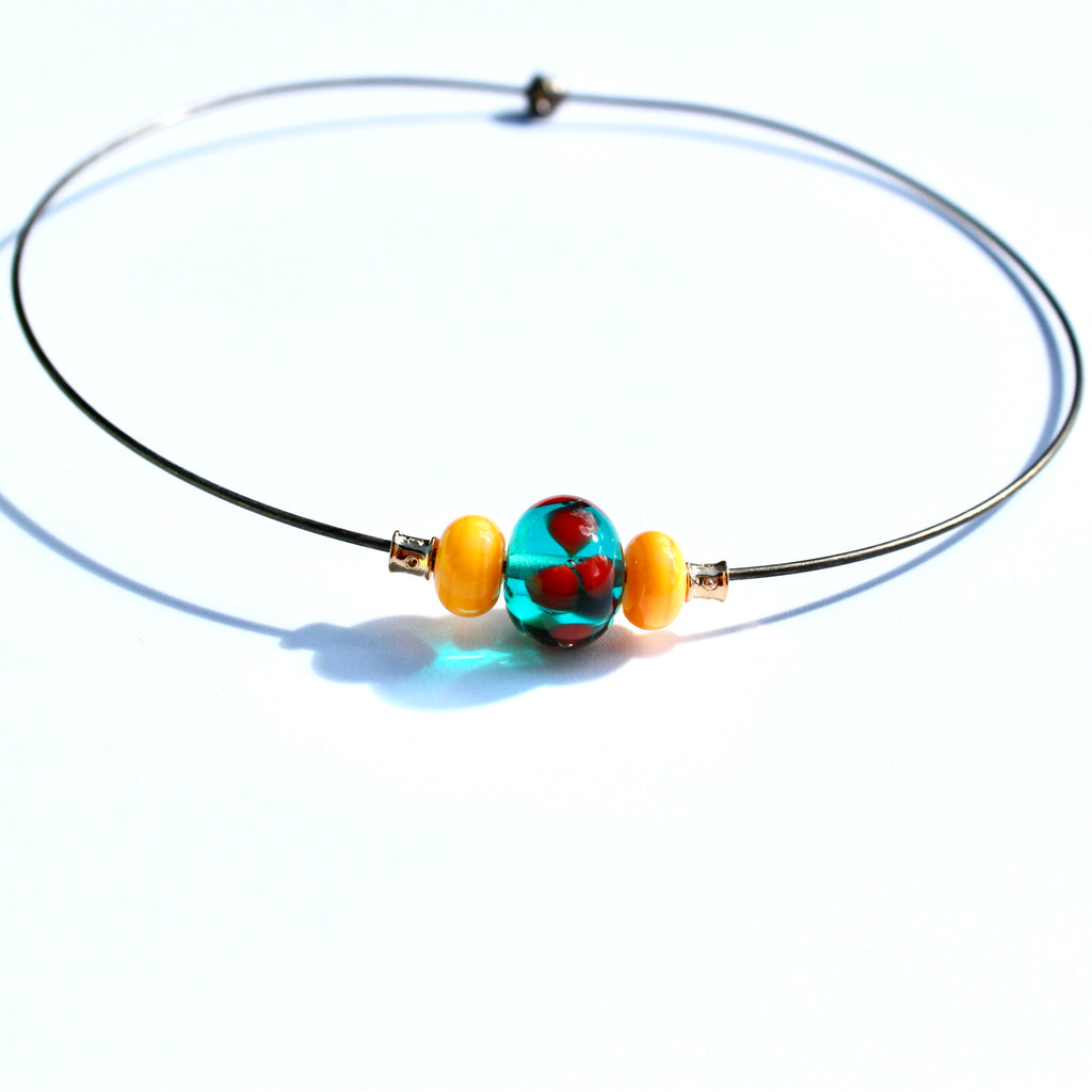 Collier en verre de Murano filé au chalumeau par Pasc@l le perlier d'art maison d'un un ras de cou semi-rigide en métal qui s'adaptera parfaitement et facilement à tous les tours de cou, en un clin d’œil joyeux.