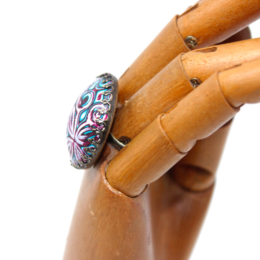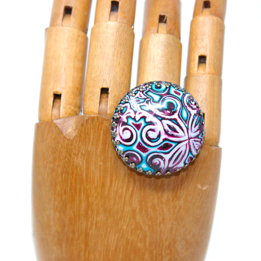 Bague ronde cabochon en pâte polymère motif graphique floral aux couleurs multicolores