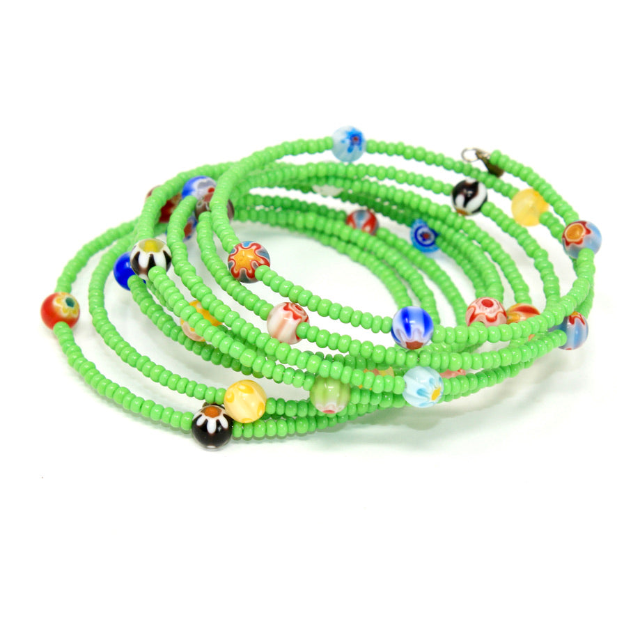 Bracelet à mémoire de forme pour un effet manchette aux couleurs pétillantes composé de 8 rangs multicolores de perles rondes millefiori en verre sur perles de rocailles de couleur verte pour démultiplier les reflets rayonnants sur votre poignet.