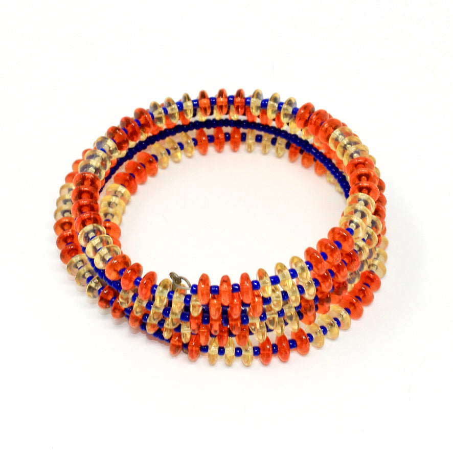 Bracelet à mémoire de forme pour un effet manchette aux couleurs pétillantes composé de 6 rangs multicolores de perles rocailles bleues, perles en verre disques vénitiens couleur miel, orange et vert, perles rondes en verre de Bohème pour démultiplier les reflets rayonnants sur votre poignet.
