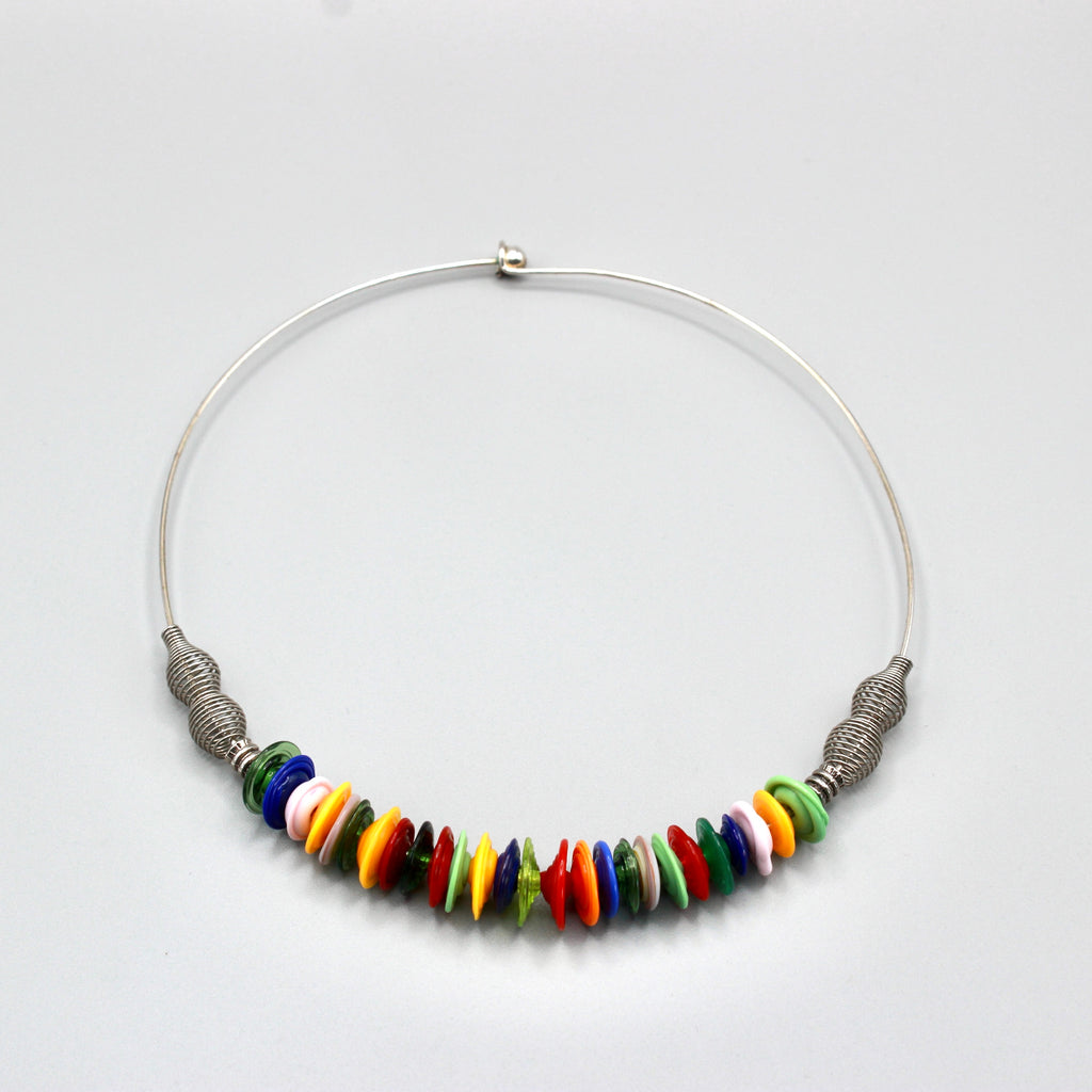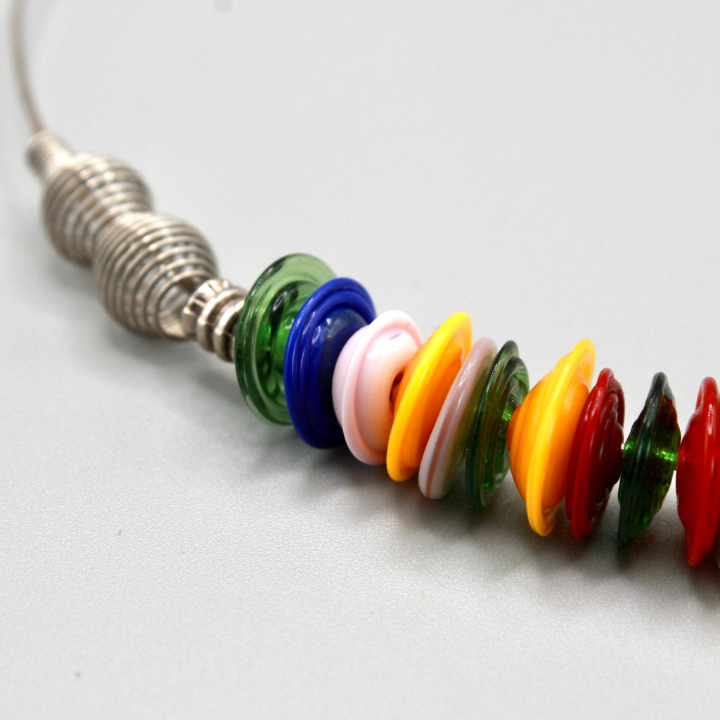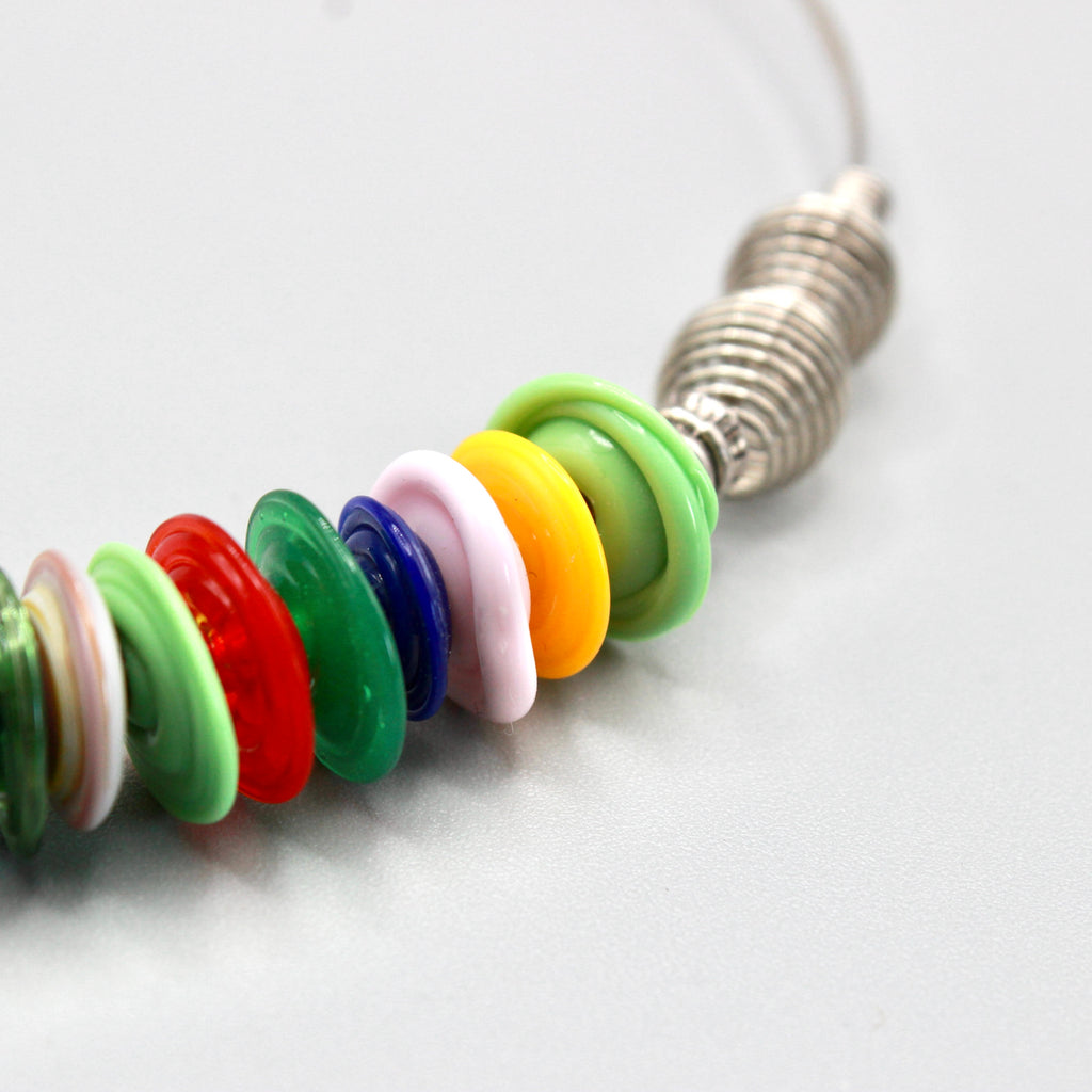 Farandole de disques en verre de Murano filé au chalumeau par Pasc@l le perlier d'art maison montée sur un ras de cou rigide en métal qui s'adaptera parfaitement et facilement à tous les tours de cou, en un clin d’œil joyeux.