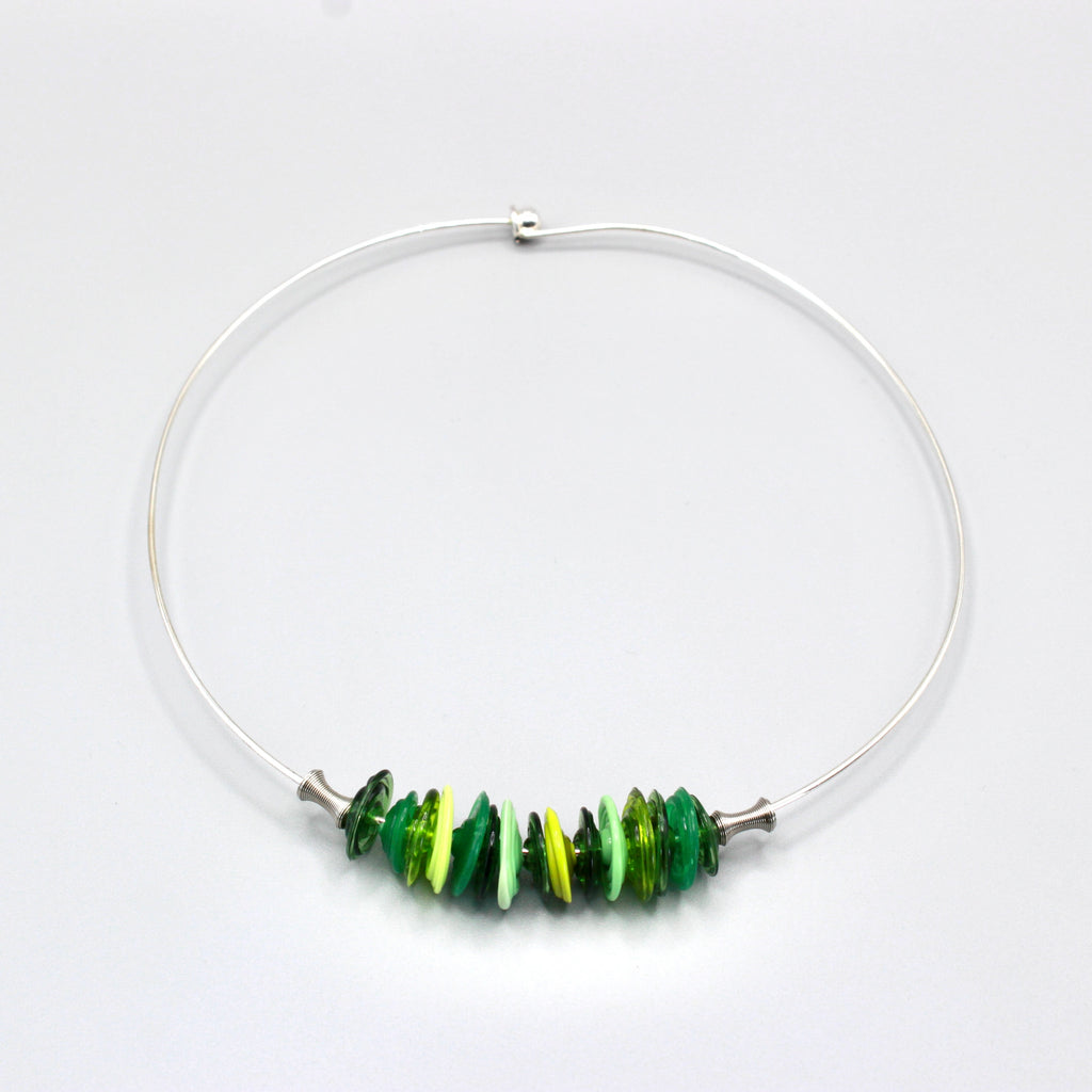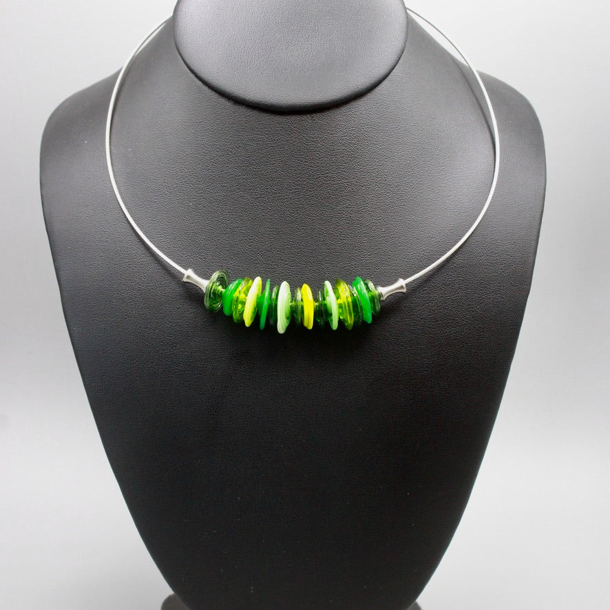 Farandole de disques en verre de Murano filé au chalumeau par Pasc@l le perlier d'art maison montée sur un ras de cou rigide en métal qui s'adaptera parfaitement et facilement à tous les tours de cou, en un clin d’œil joyeux.