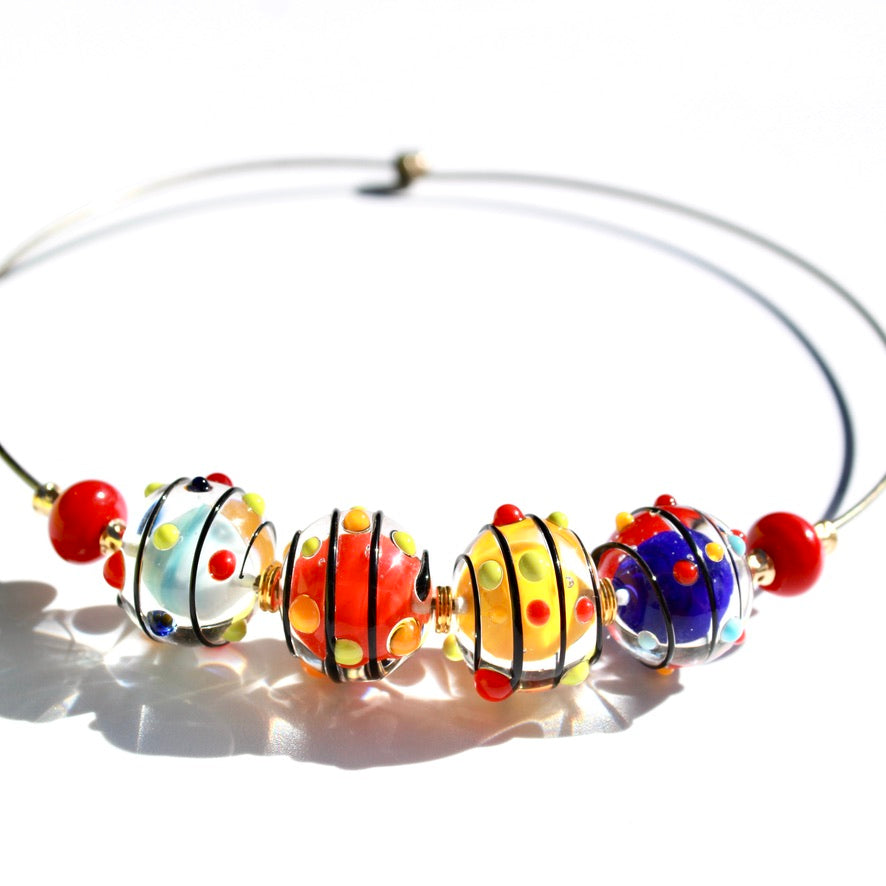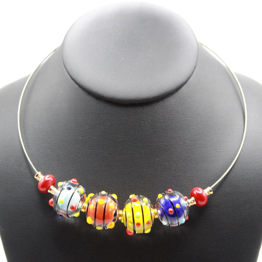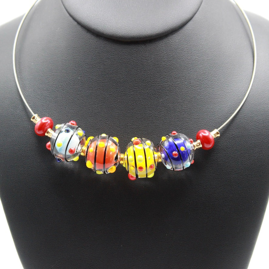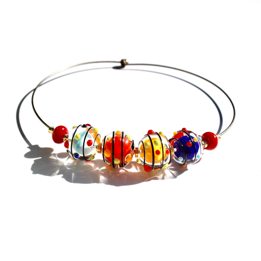 Collier en verre de Murano filé au chalumeau par Pasc@l le perlier d'art maison d'un un ras de cou semi-rigide en métal qui s'adaptera parfaitement et facilement à tous les tours de cou, en un clin d’œil joyeux.