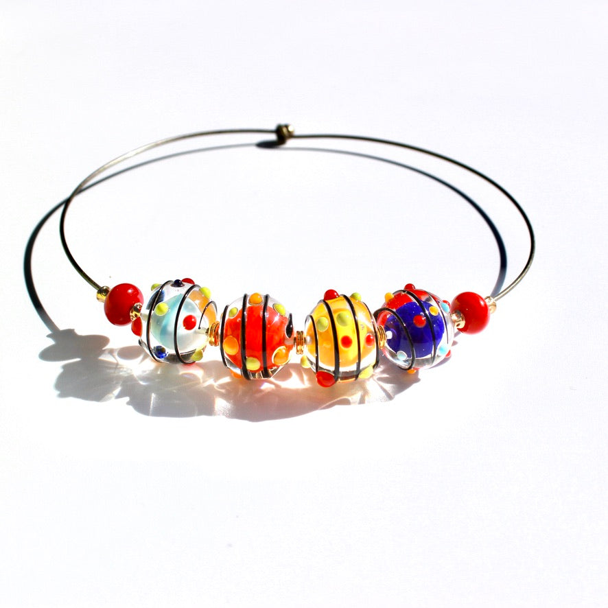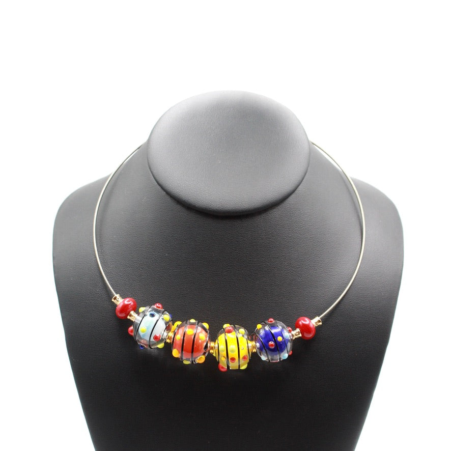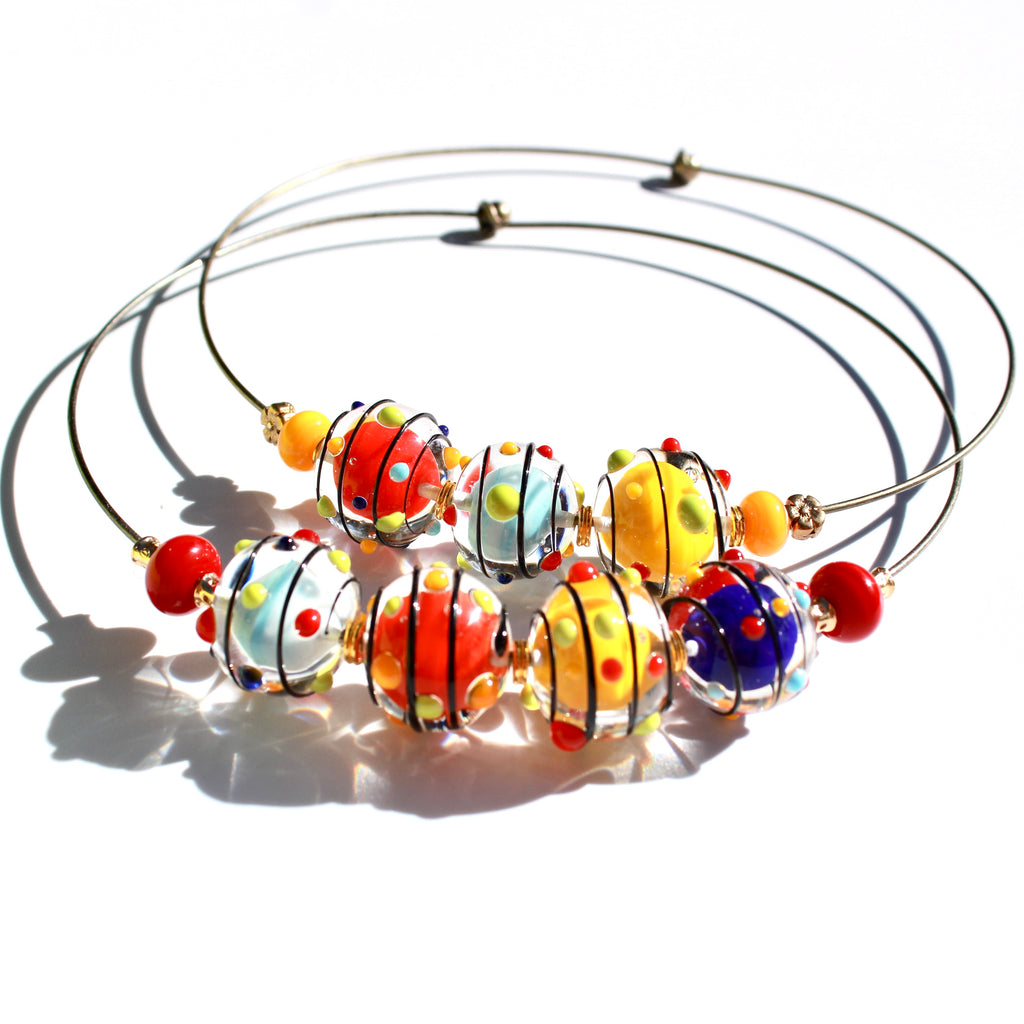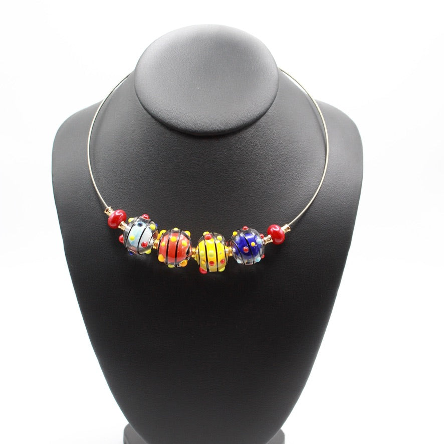 Collier en verre de Murano filé au chalumeau par Pasc@l le perlier d'art maison d'un un ras de cou semi-rigide en métal qui s'adaptera parfaitement et facilement à tous les tours de cou, en un clin d’œil joyeux.