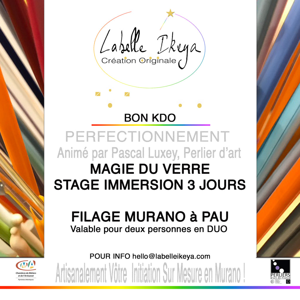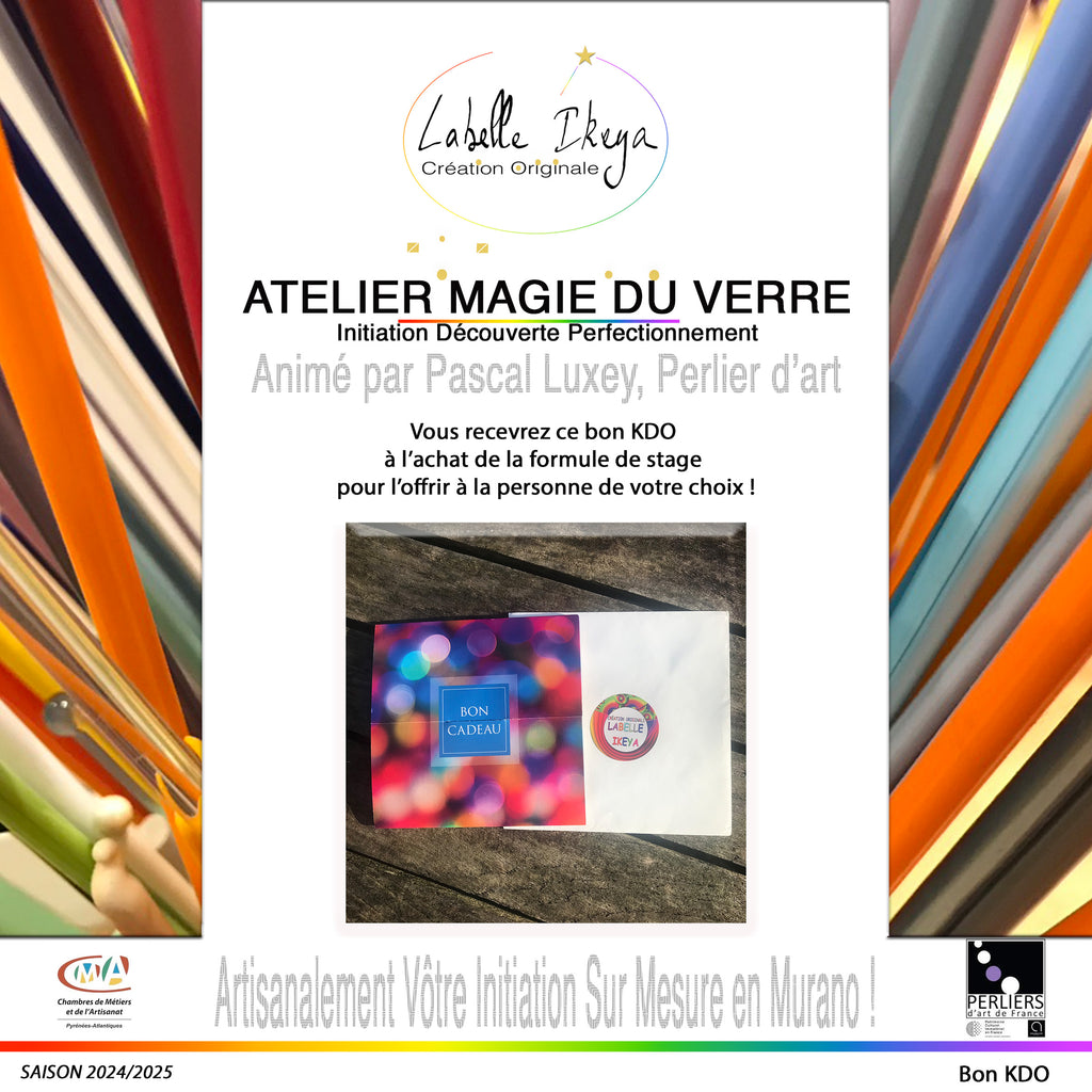 À l'achat de ce bon KDO valable un an, vous recevrez la formule Stage immersion DUO 2 jours consécutifs Magie du Verre soit un périple de 14 heures derrière le chalumeau avec Pascal, le perlier d'art maison.