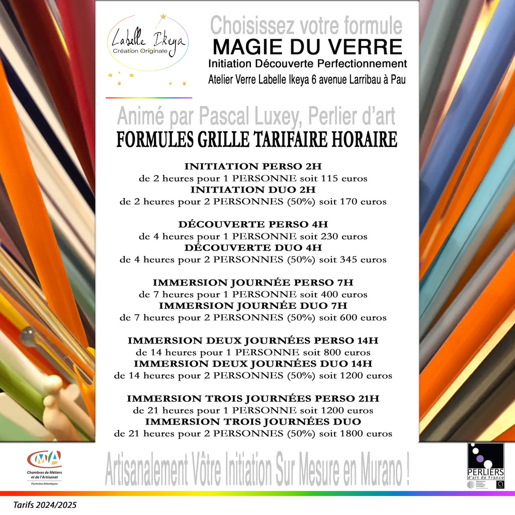 Deux jours pour dompter la flamme, façonner la perfection et surtout repartir, fièrement, avec des œuvres scintillantes qui semblent avoir capturé l’âme même du verre en sachant les refaire après avoir acquis ce sacré savoir-faire ensemble, l'aventure est à portée de mains d’œuvre humaine .... laissez-vous tenter par cette unique expérience inédite aux portes des Pyrénées chez Labelle Ikeya !