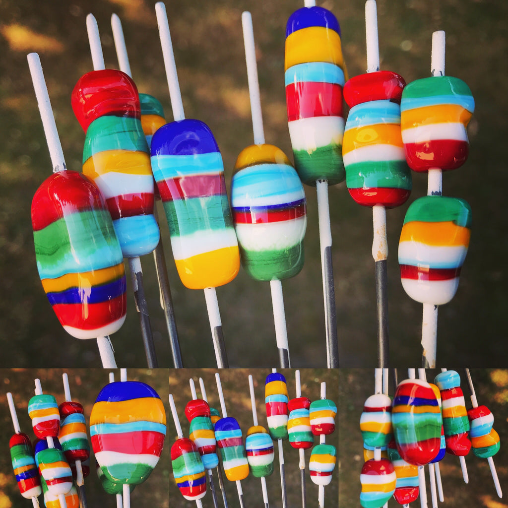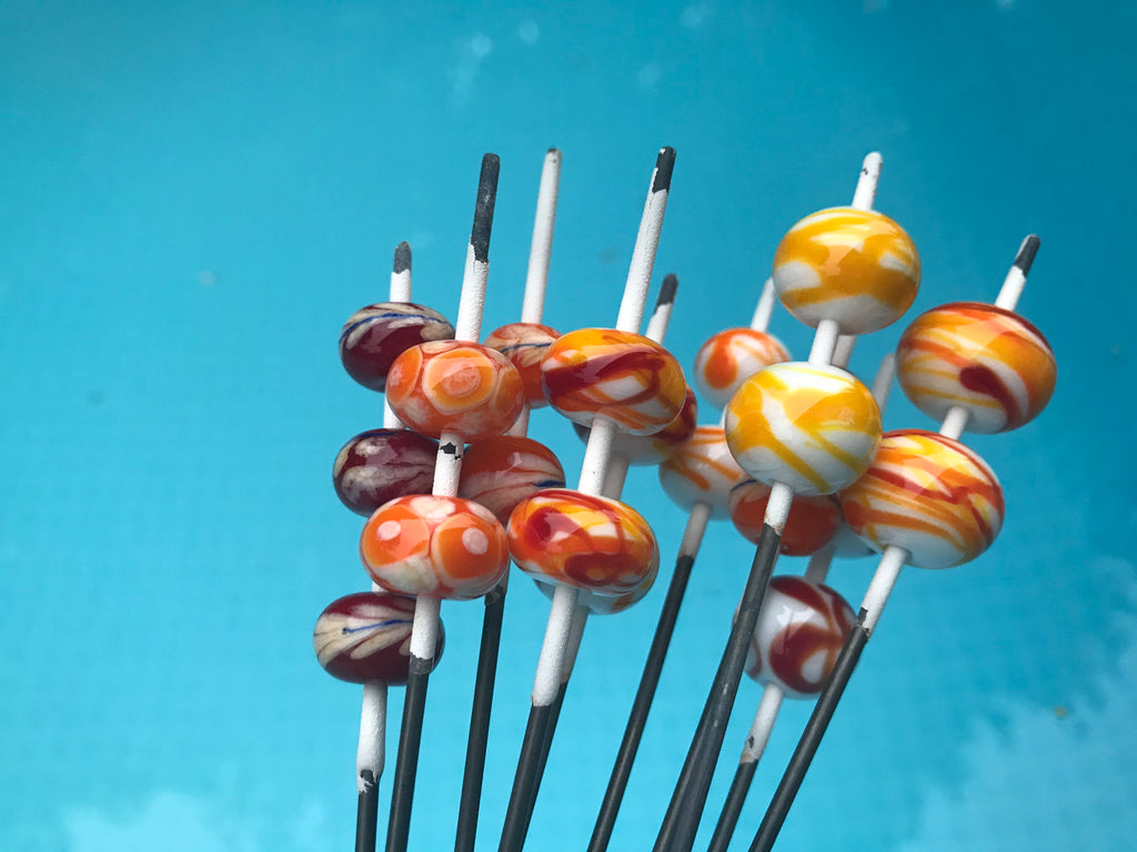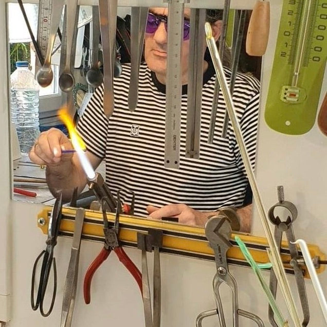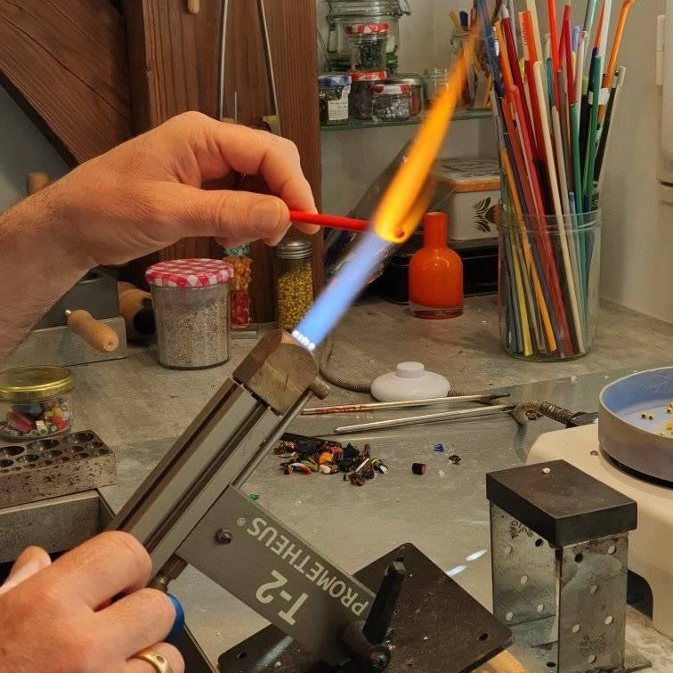 Qu’il s’agisse de perles flamboyantes aux techniques graphiques ou géométriques, de précieuses perles à murrines ou de délicates roses de verre, chaque création devient un défi palpitant, une lutte passionnée contre la matière en fusion.