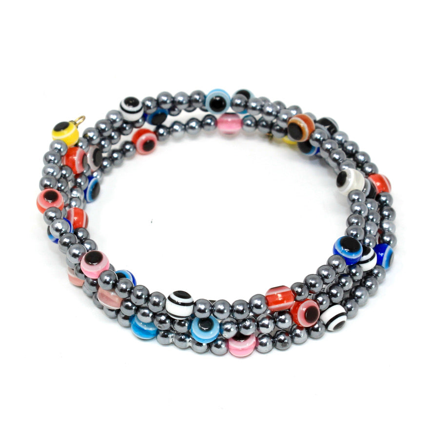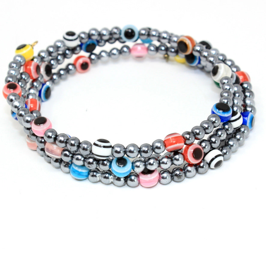 aux couleurs élégantes composé de 4 rangs multicolores de perles rondes grises associées à des perles rondes yeux multicolores en acryliques le tout mélangé harmonieusement pour démultiplier les reflets rayonnants sur votre poignet.