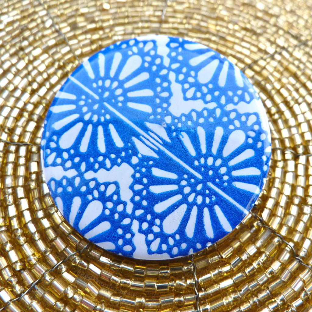 Pièce artisanale forme ronde plate en pâte polymère au motif élégant graphique bleu