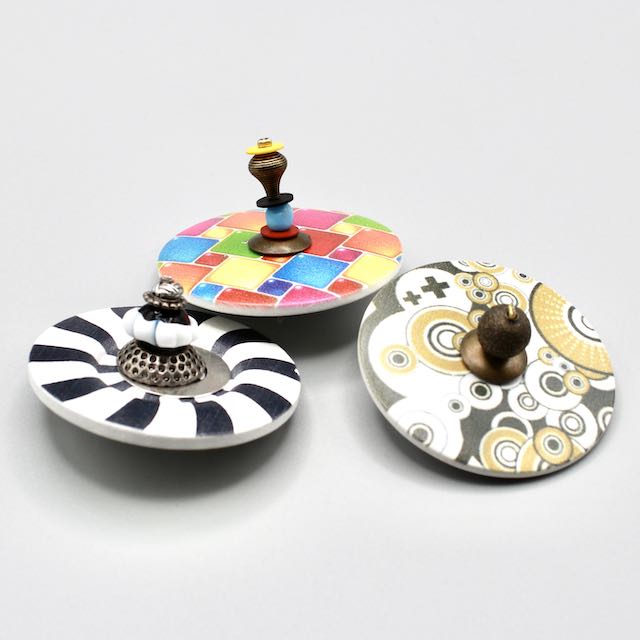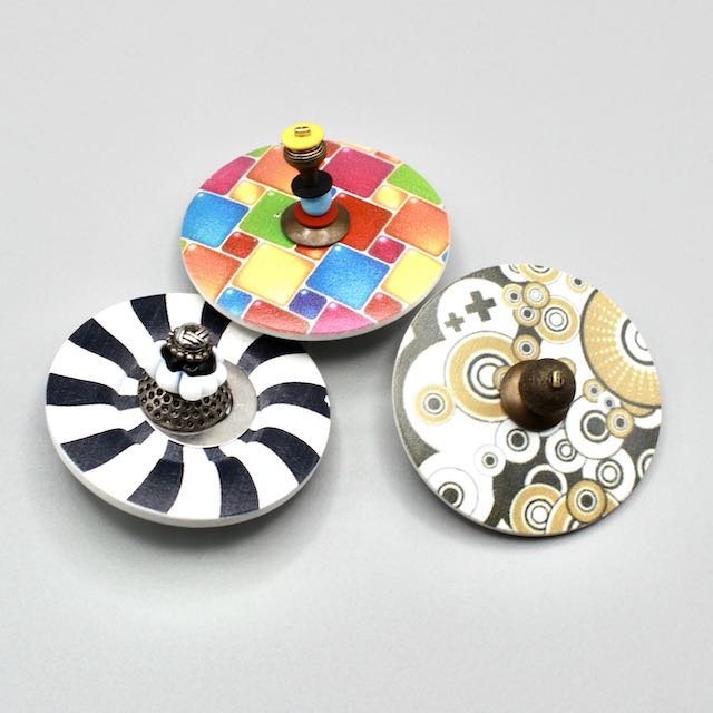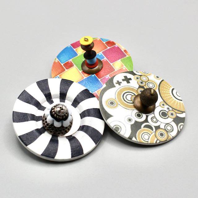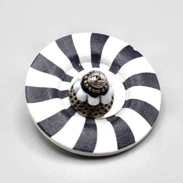 Véritable bouton revisité rond en bois au motif d'une toupie spirale noire et blanche