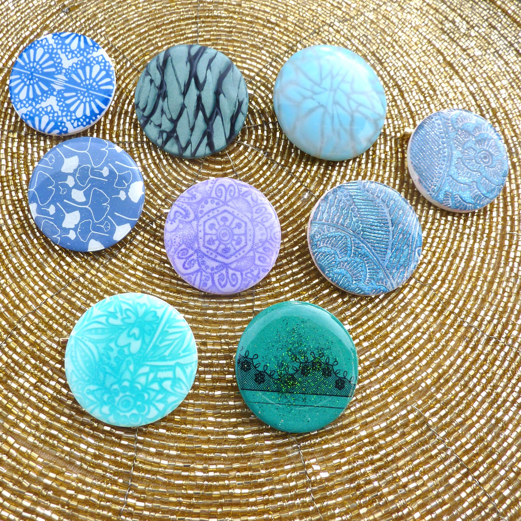 Pièce artisanale forme ronde donuts plat en pâte polymère au motif élégant de nuages bleus