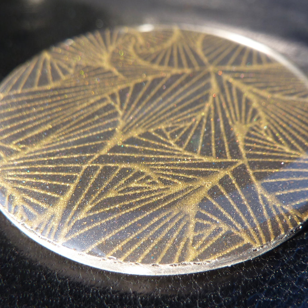 Pièce artisanale ronde en pâte polymère au motif graphique délicat noir et doré