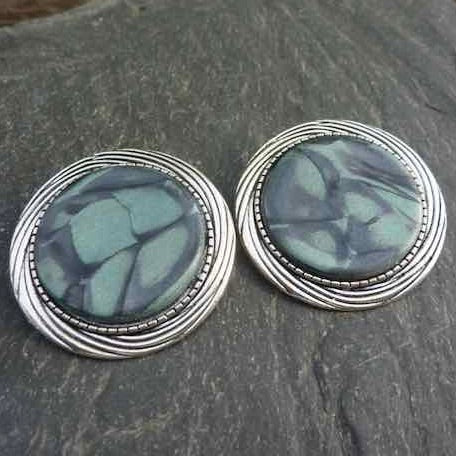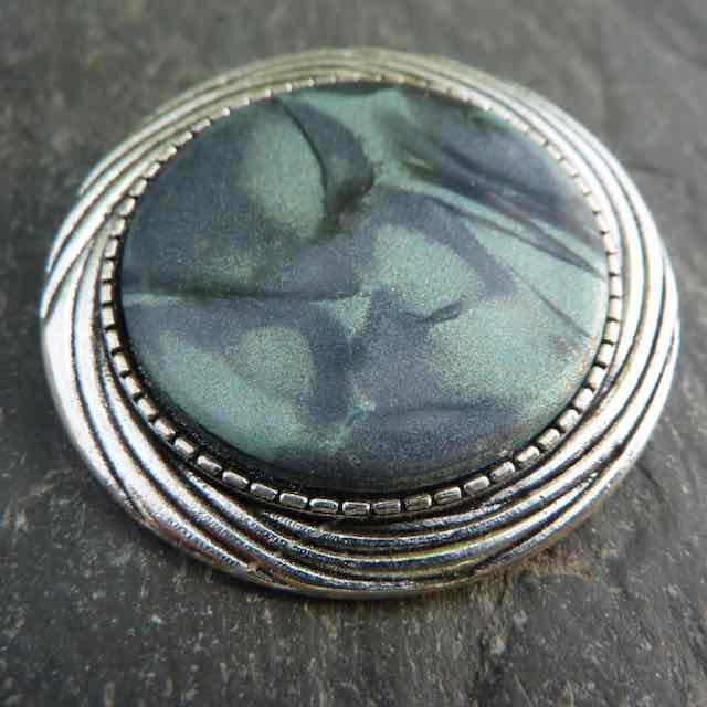 Pièce artisanale ronde en pâte polymère au motif graphique délicat noir et vert  d'un espace à identifier non encore connu dans l'espace ...