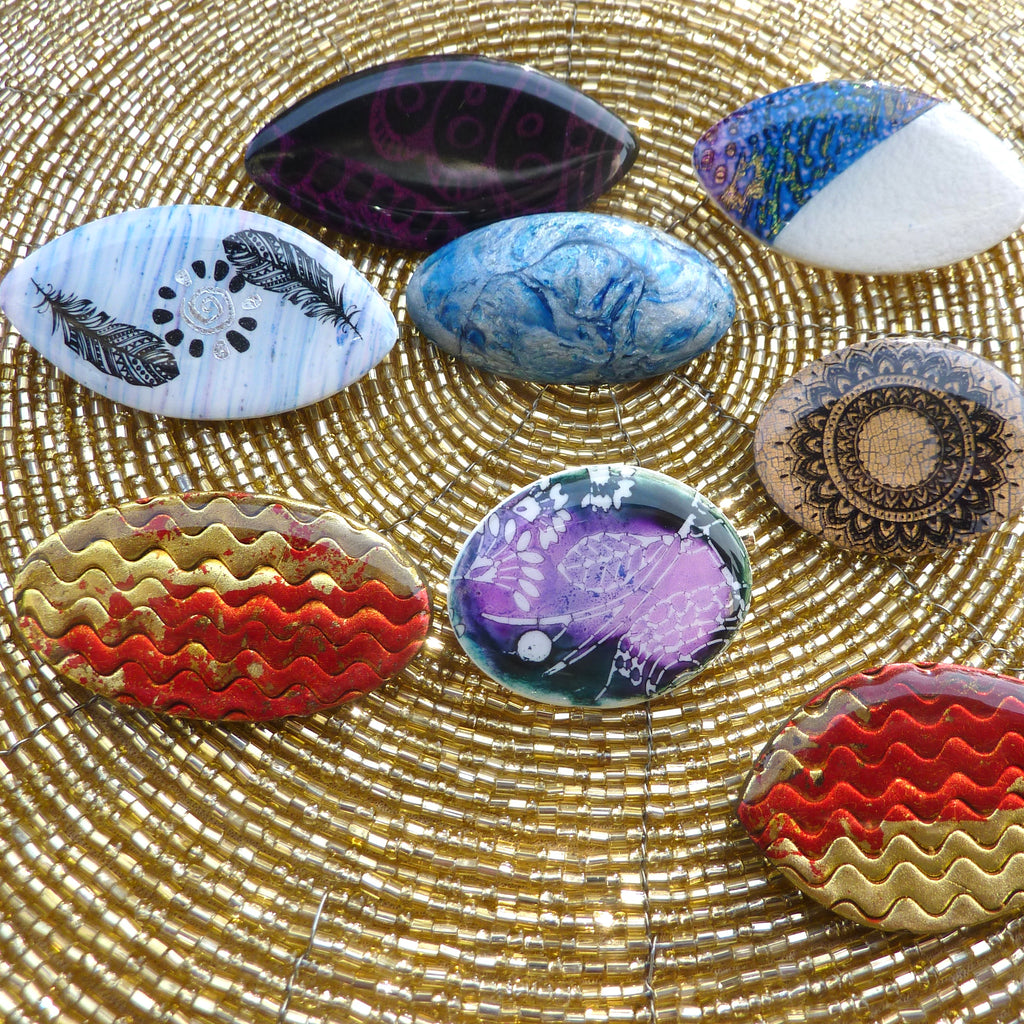 Pièce artisanale forme navette plate en pâte polymère au motif élégant de deux plumes autour d'un cercle symbolique stylisé noir sur blanc et bleu