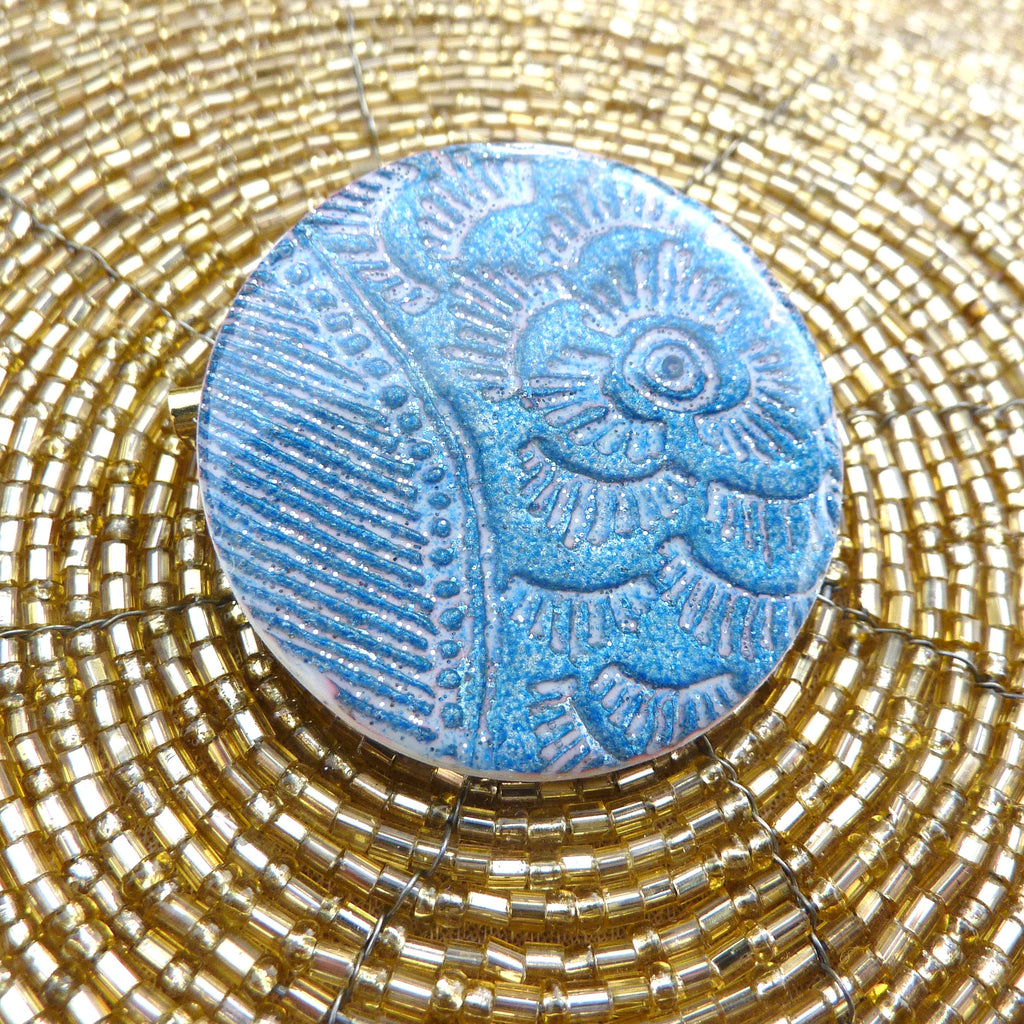 Pièce artisanale ronde plate en pâte polymère au motif graphique délicat blue jean d'un espace à identifier non encore connu dans l'espace azurien  ...