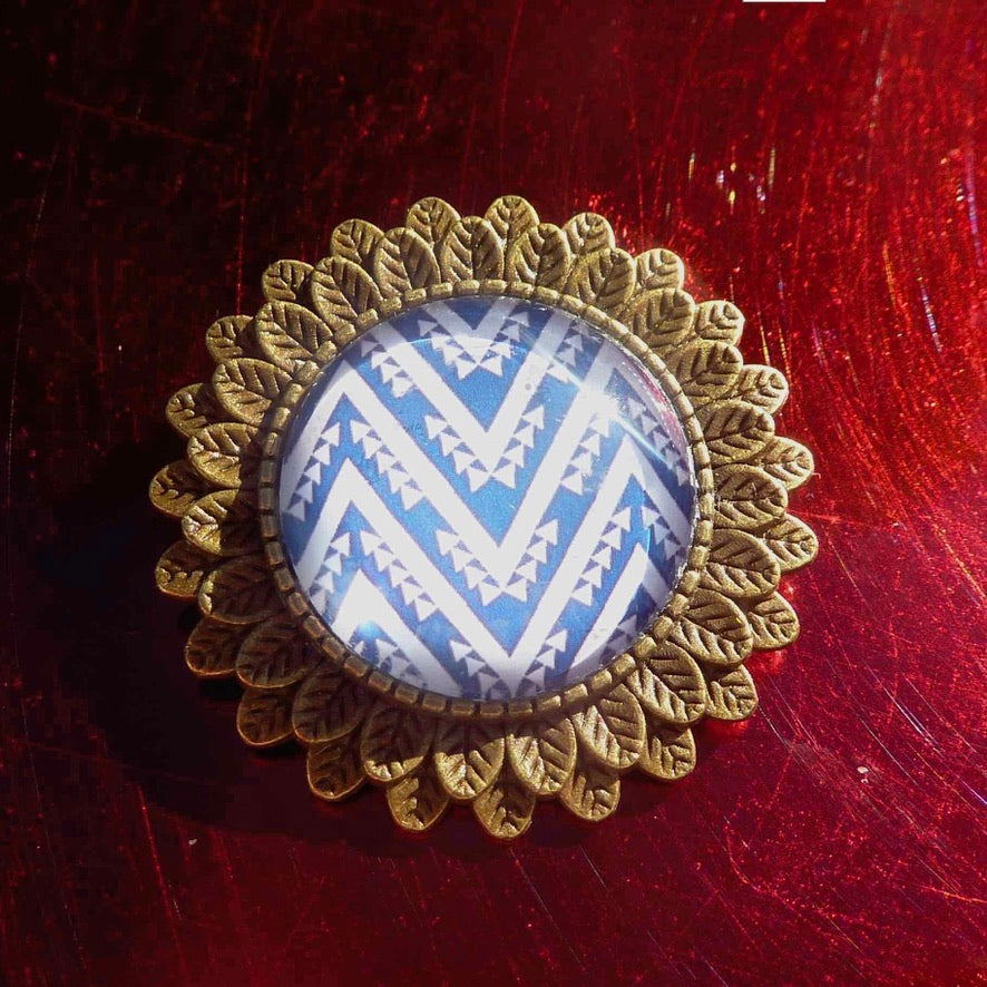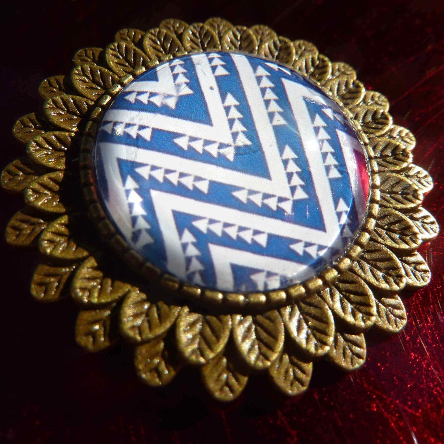 Pièce artisanale ronde cabochon en verre bombé sur motif graphique blanc et bleu de 2O mm