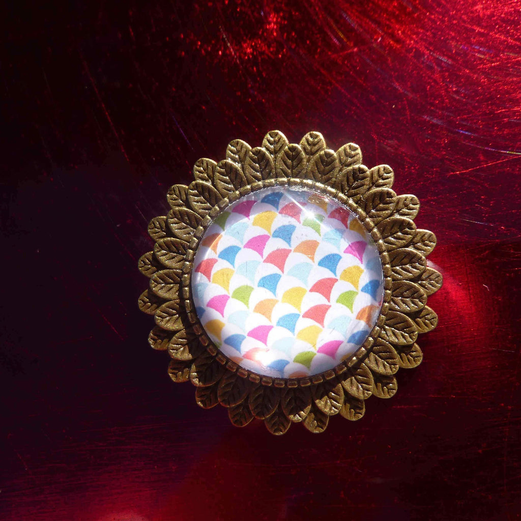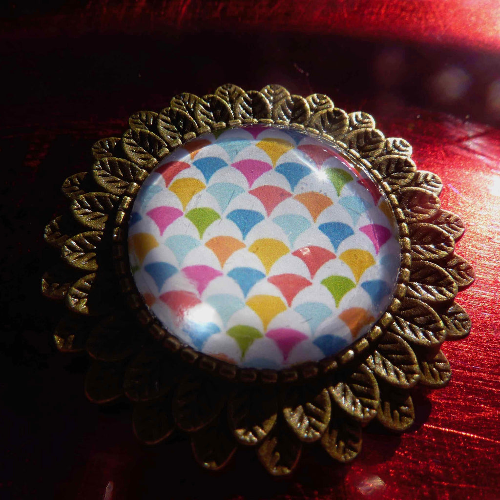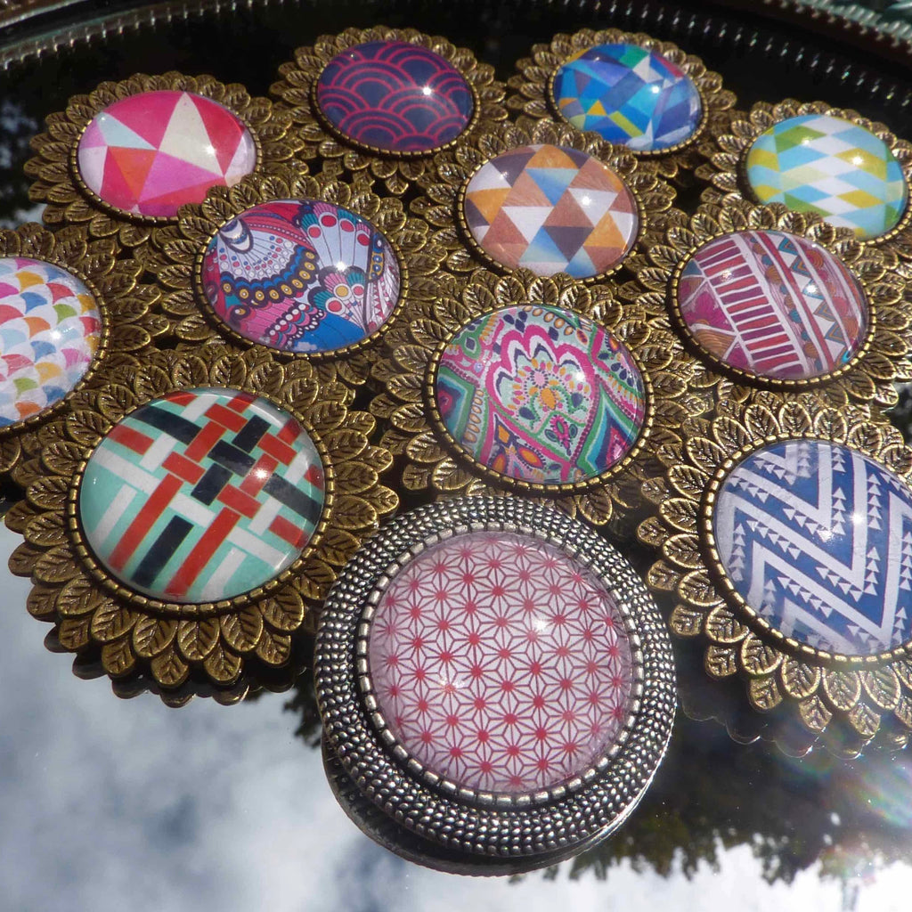 Pièce artisanale ronde cabochon en verre bombé sur motif graphique multicolore de 2O mm