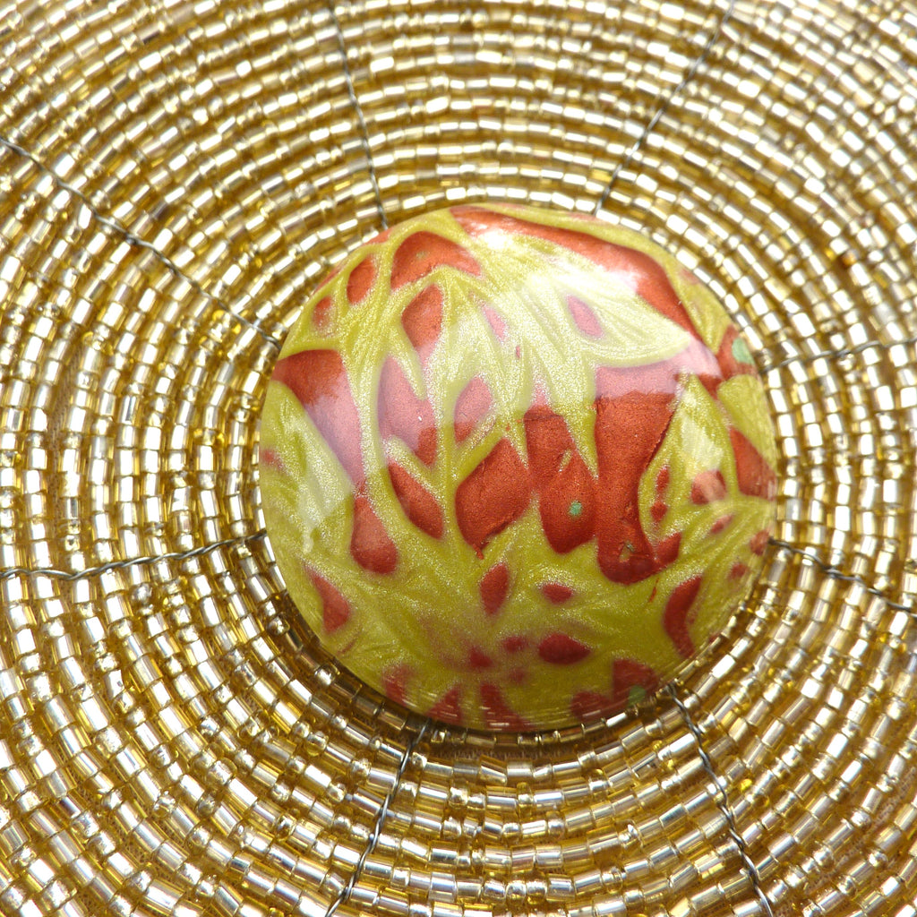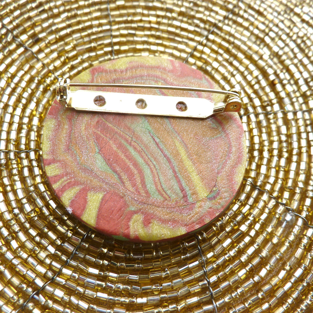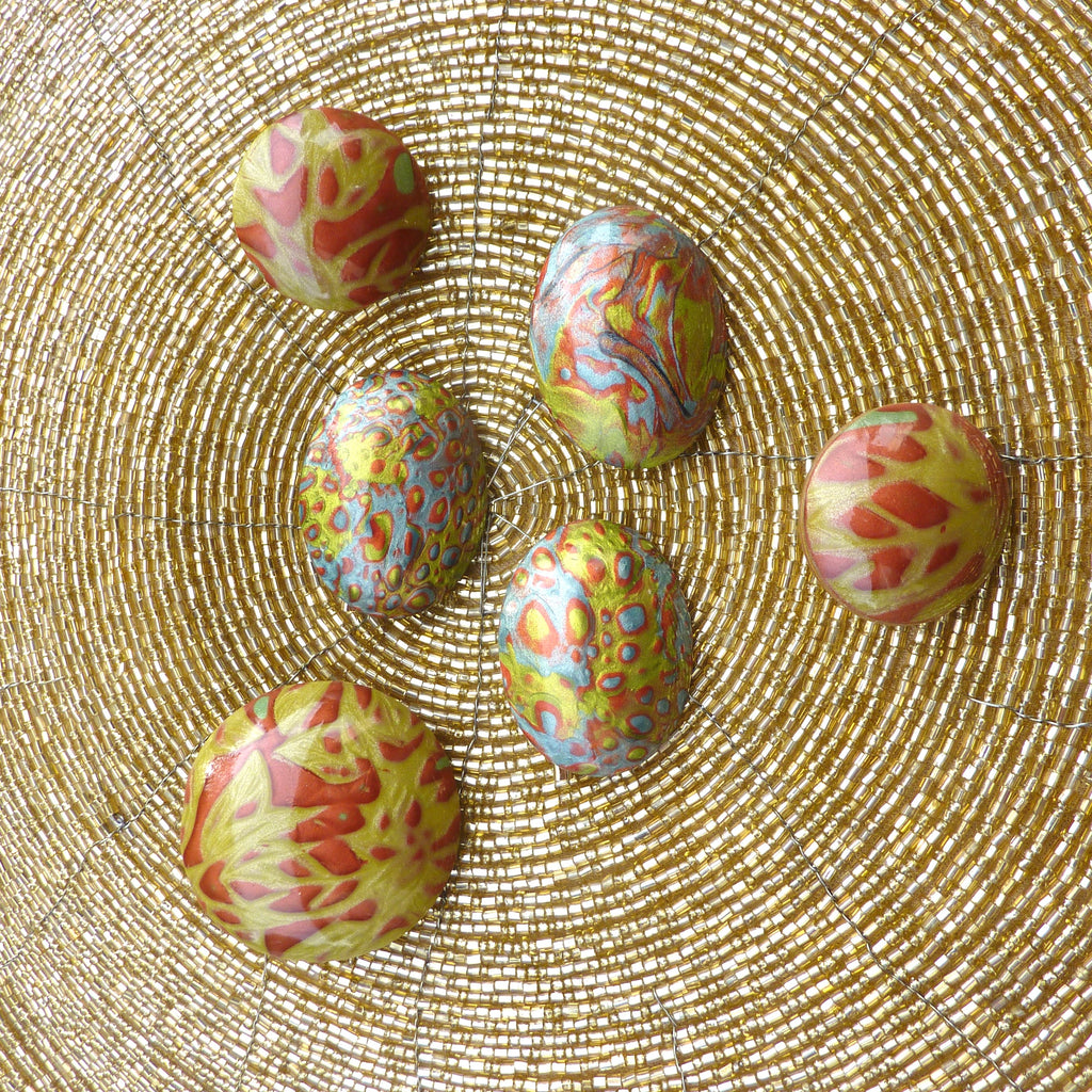 Pièce artisanale ronde bombée cabochon en pâte polymère au motif élégant de l'écorce terrestre multicolore dans des nuances subtiles d'exploration prolongée ...