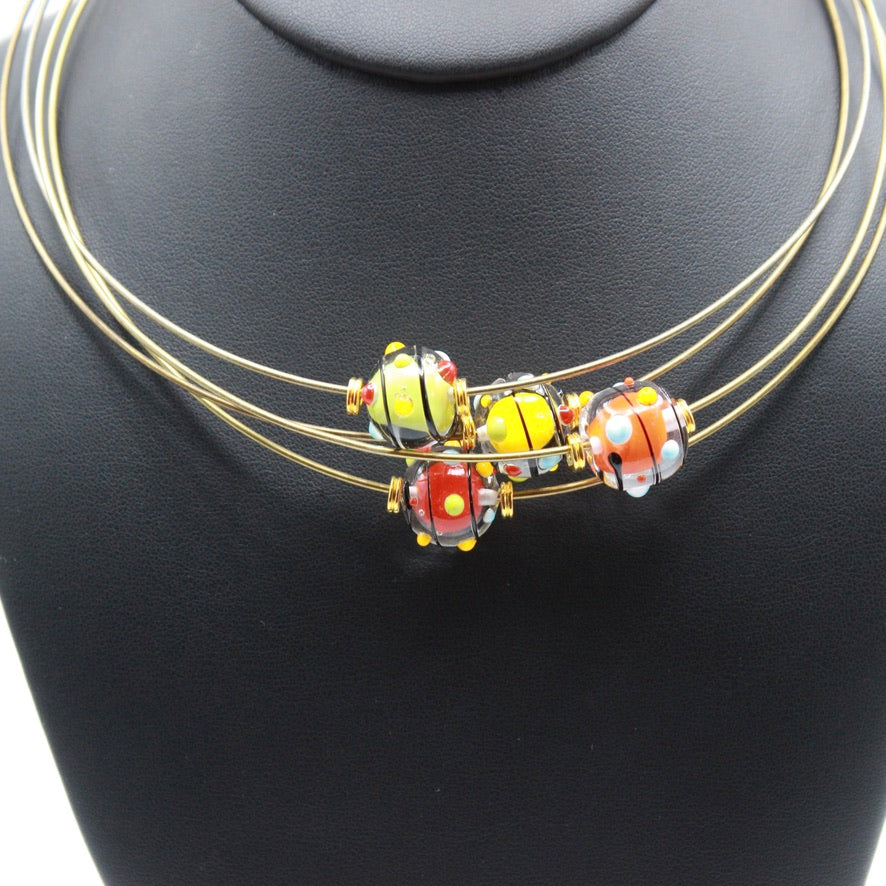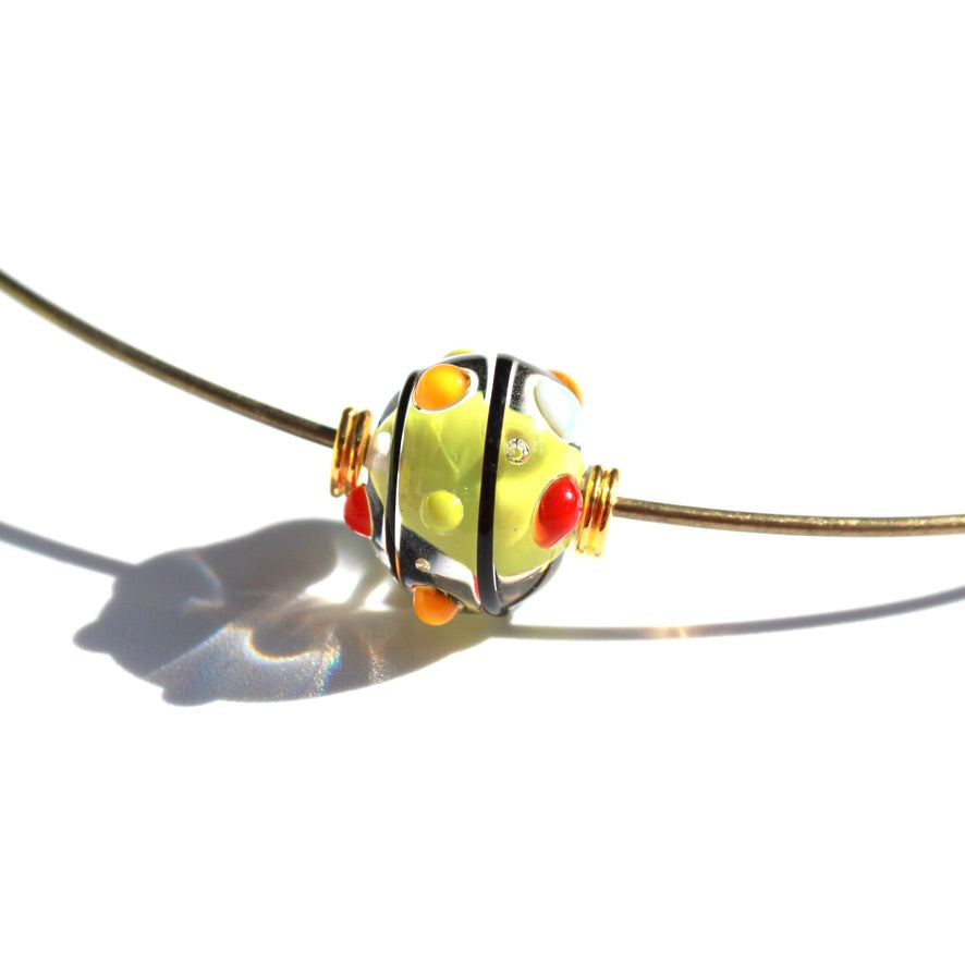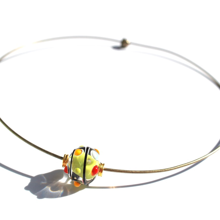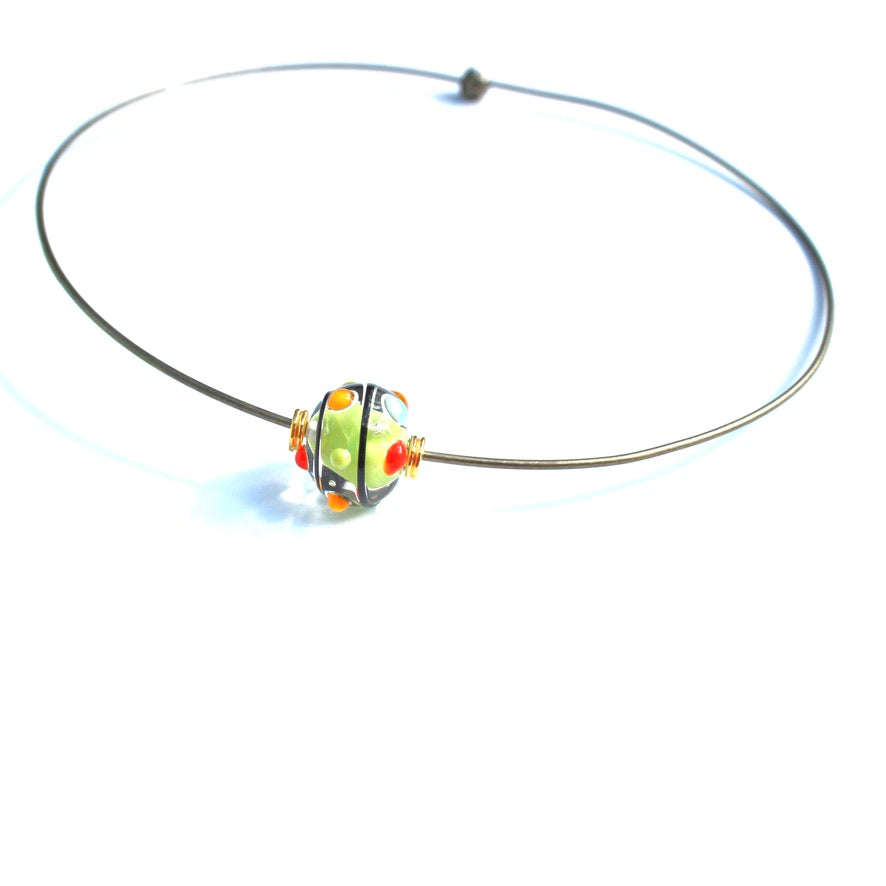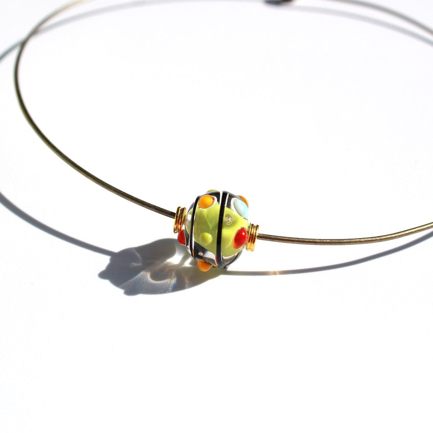 Collier en verre de Murano filé au chalumeau par Pasc@l le perlier d'art maison d'un un ras de cou semi-rigide en métal qui s'adaptera parfaitement et facilement à tous les tours de cou, en un clin d’œil joyeux.