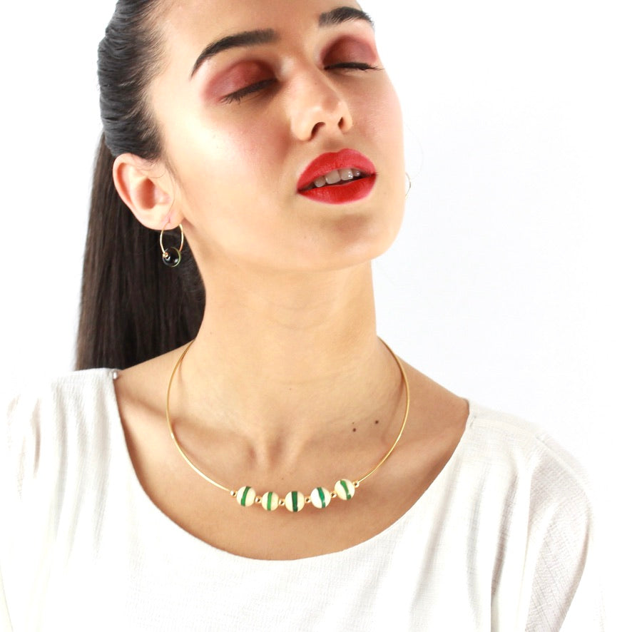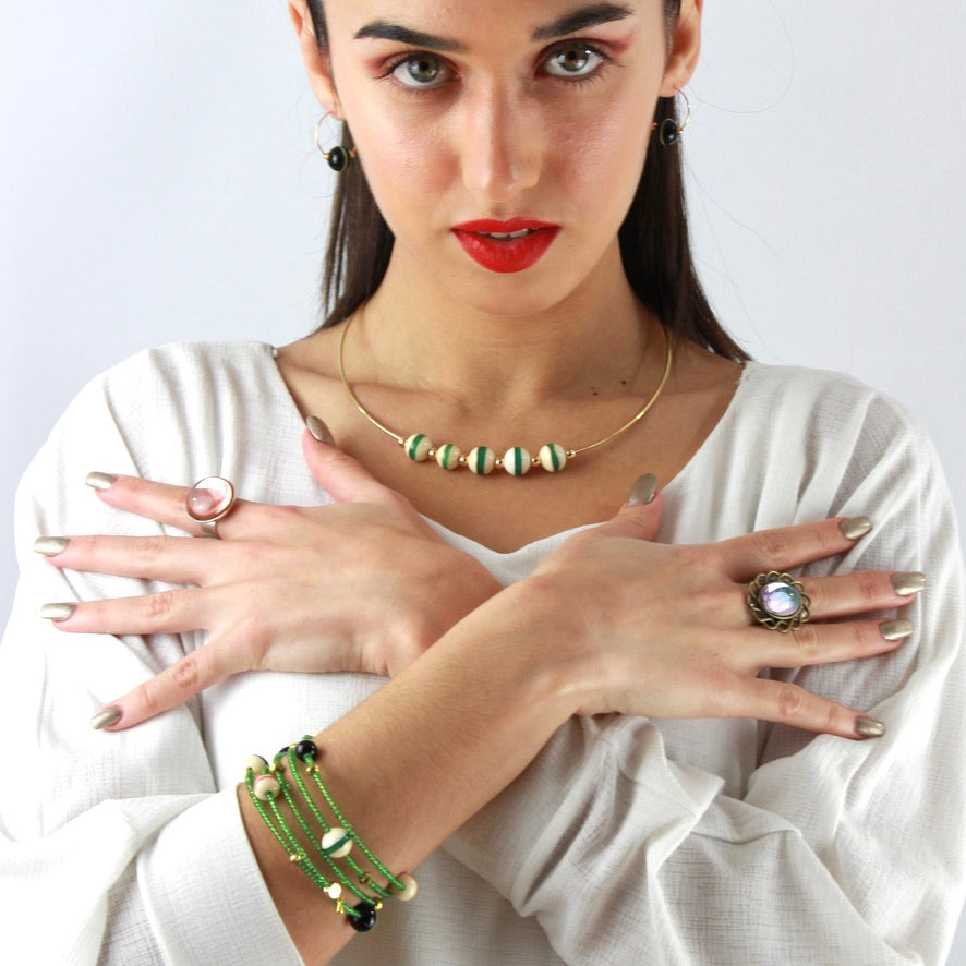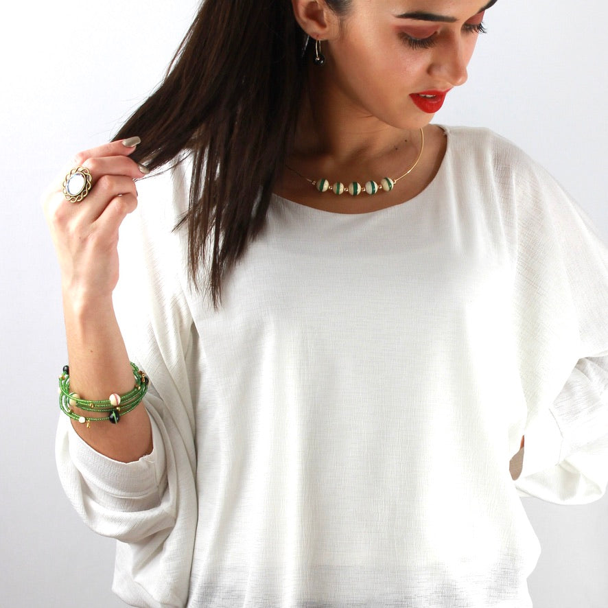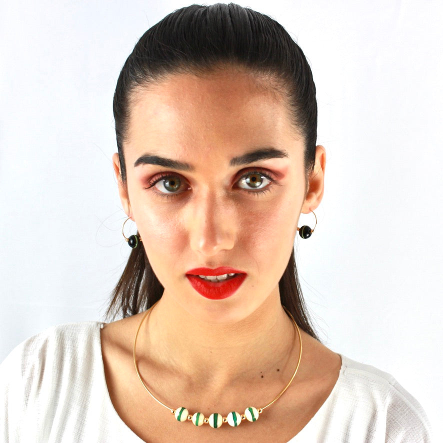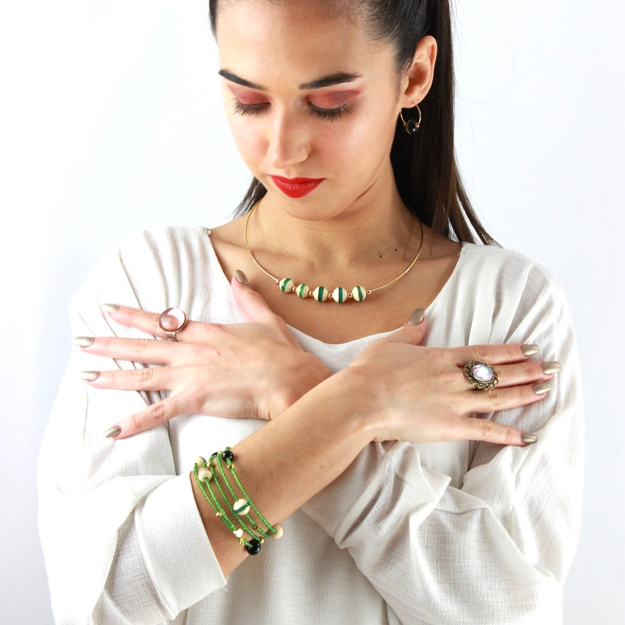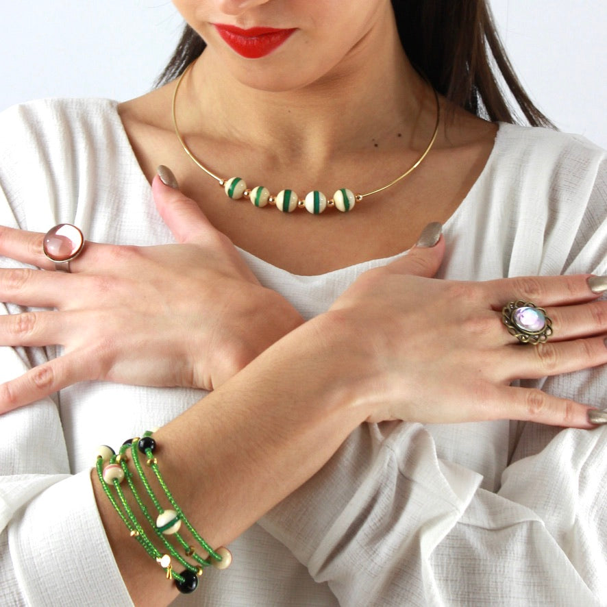 Perles centrales rondes satellites couleur couleur ivoire liseret vert en verre de Murano filé au chalumeau maison (5)