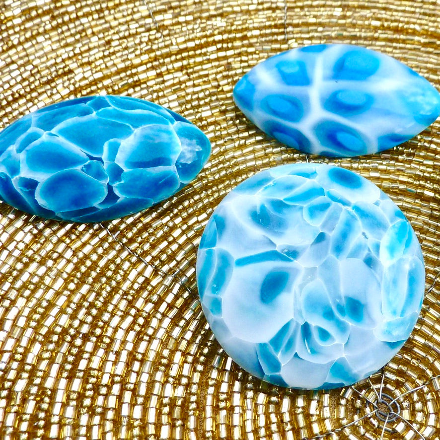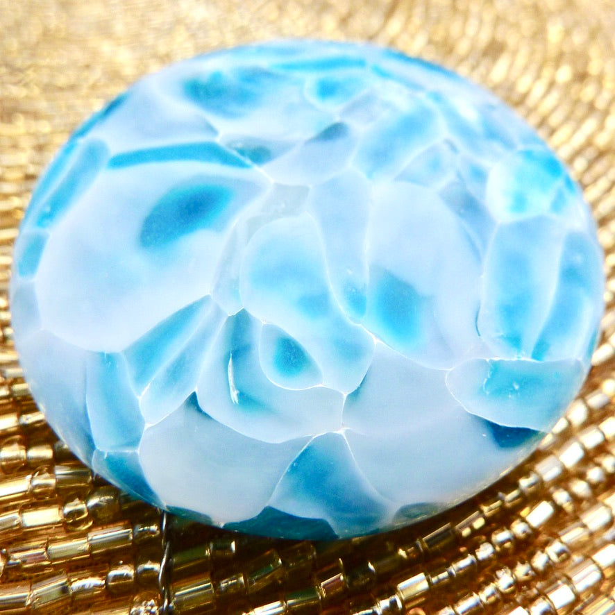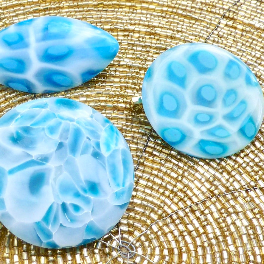 Pièce artisanale forme ronde plate en pâte polymère au motif élégant de planètes bleues qui se fondent dans l'espace vierge ....
