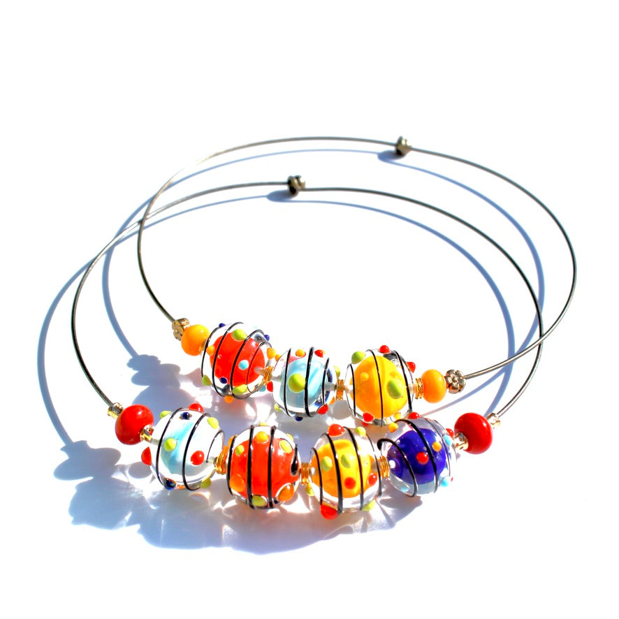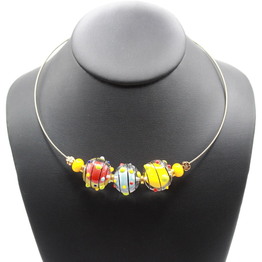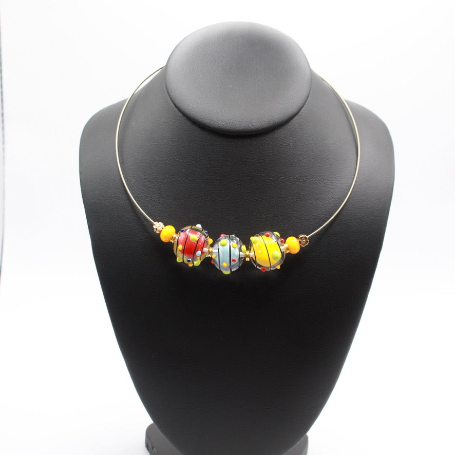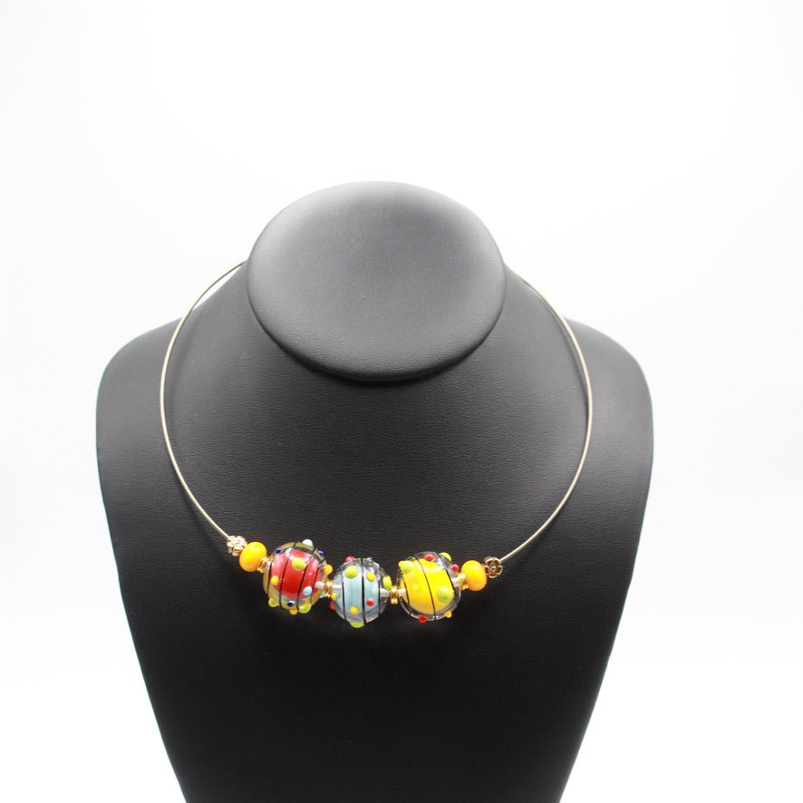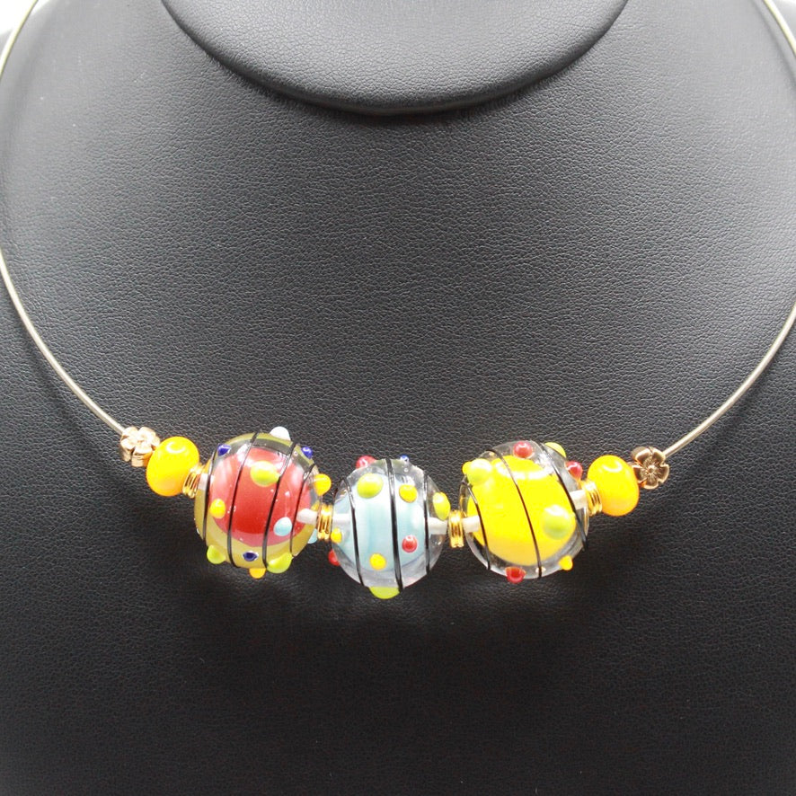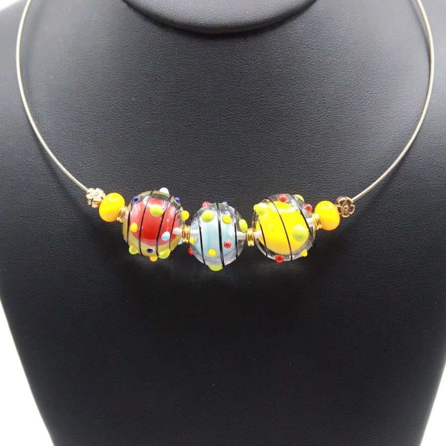 Collier en verre de Murano filé au chalumeau par Pasc@l le perlier d'art maison d'un un ras de cou semi-rigide en métal qui s'adaptera parfaitement et facilement à tous les tours de cou, en un clin d’œil joyeux.