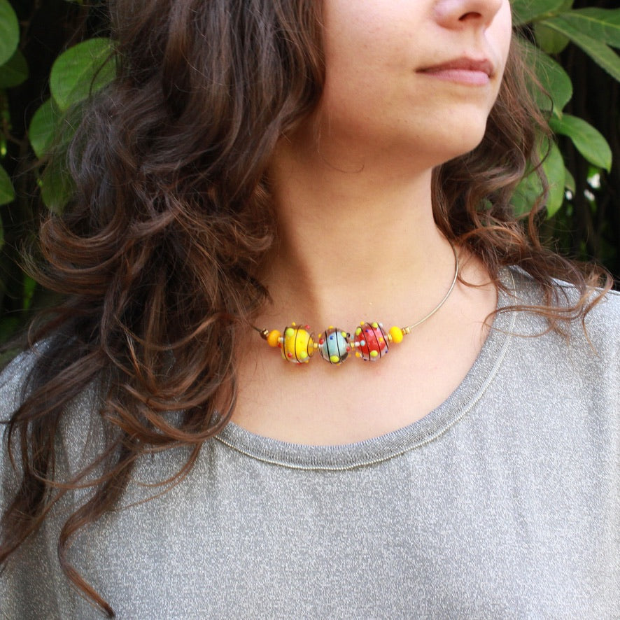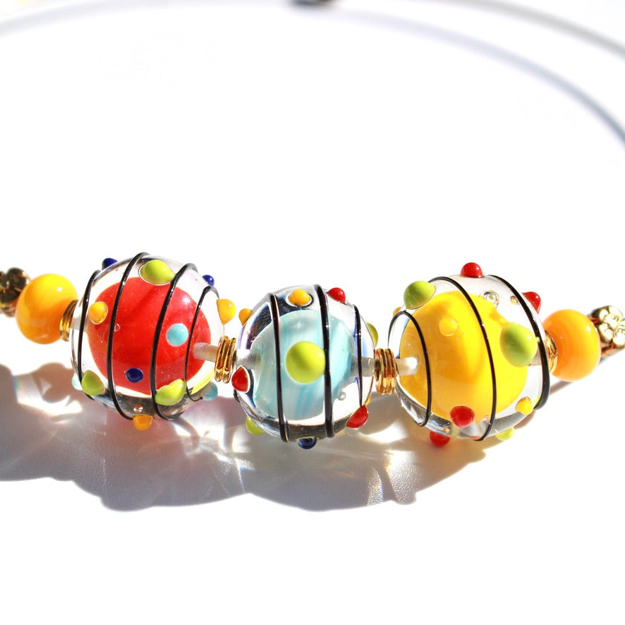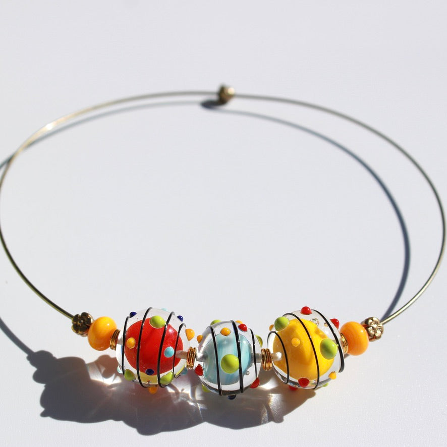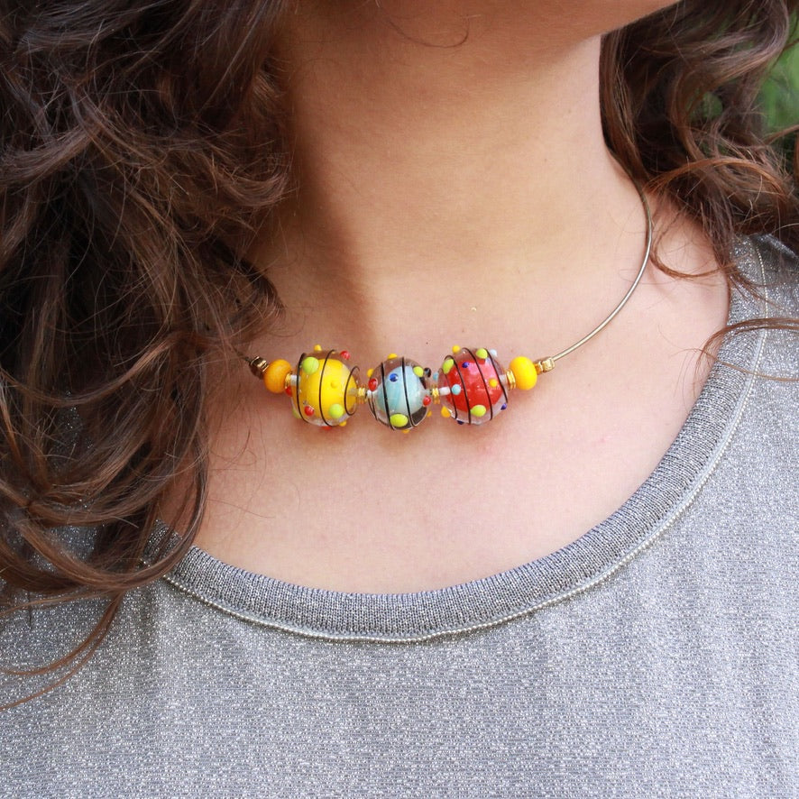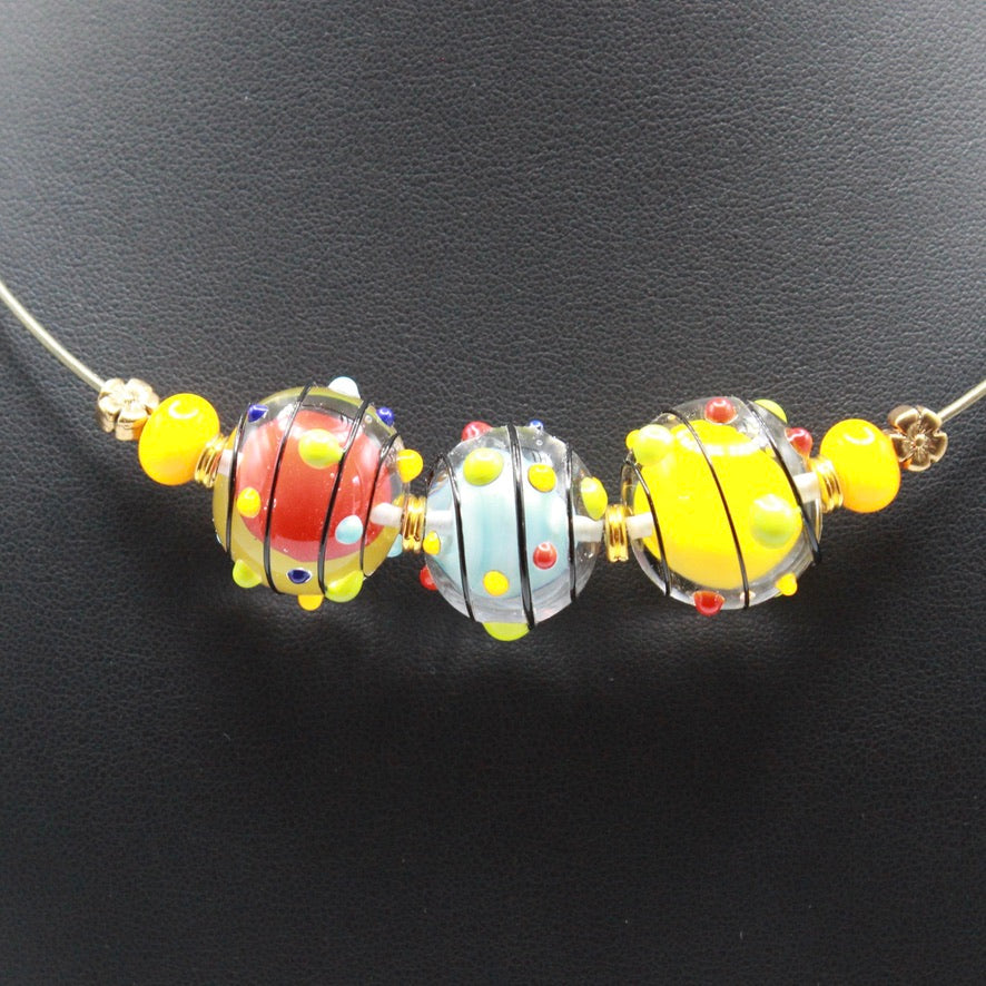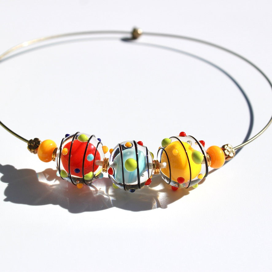 Collier en verre de Murano filé au chalumeau par Pasc@l le perlier d'art maison d'un un ras de cou semi-rigide en métal qui s'adaptera parfaitement et facilement à tous les tours de cou, en un clin d’œil joyeux.