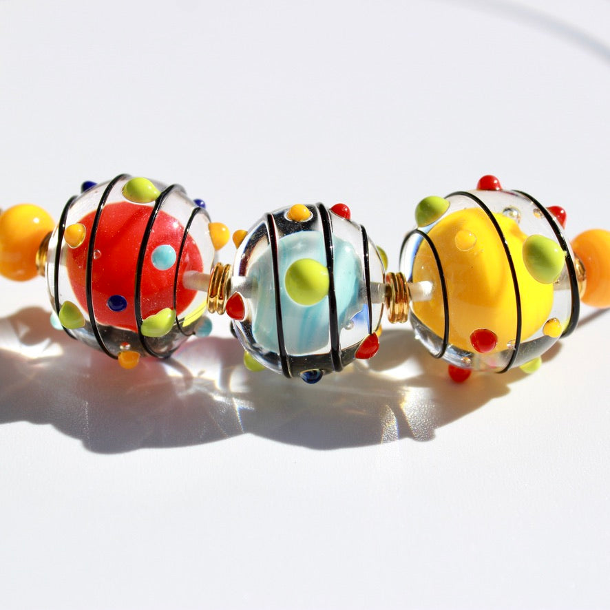 Perles Satellites arc en ciel e à picots Multicolores sur une spirale filée en noir en verre de Murano maison filé à la flamme (3 de 30 mm) - Perles grandes tailles