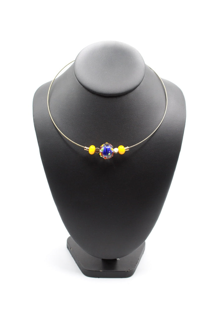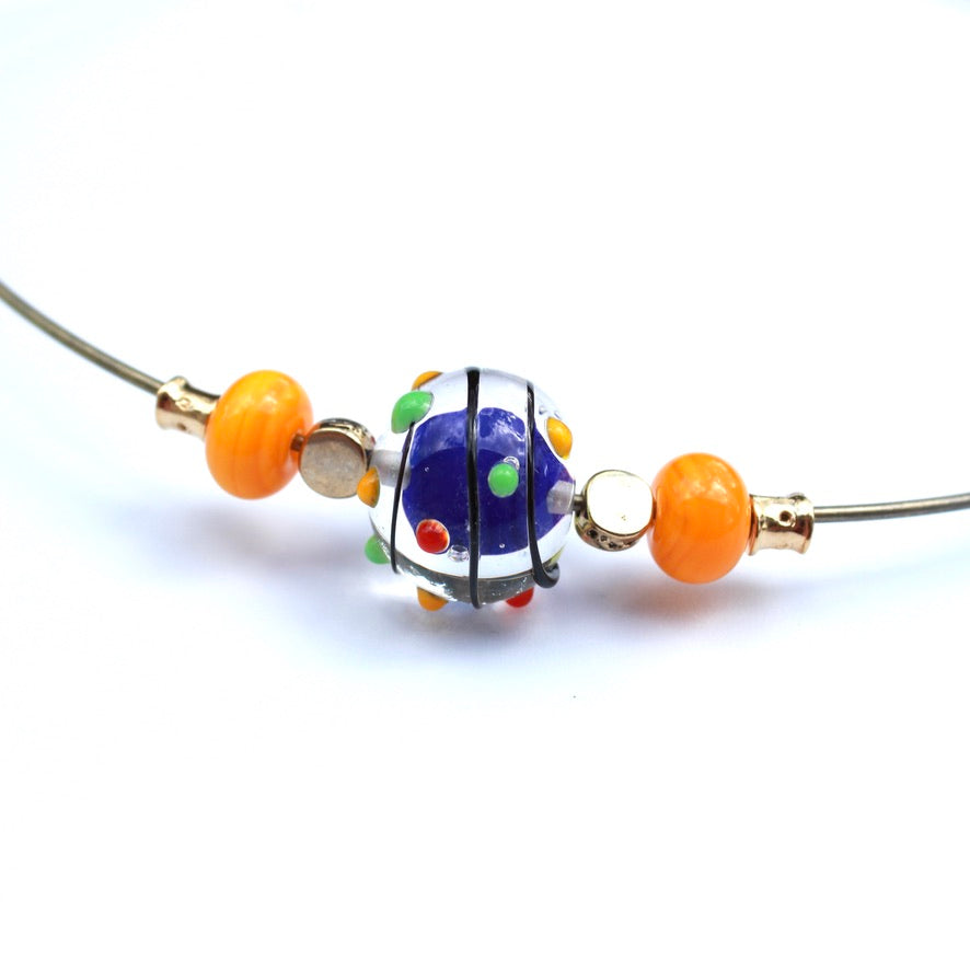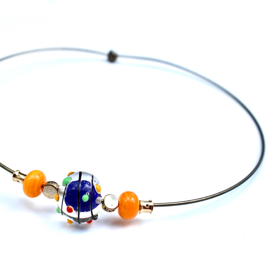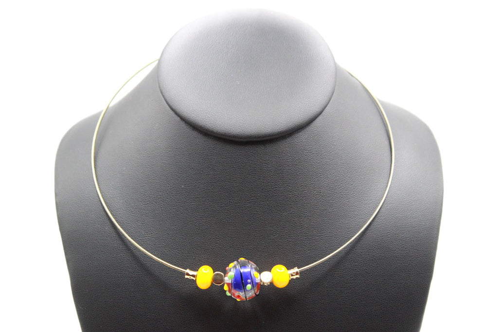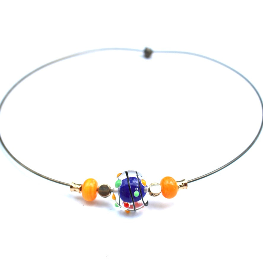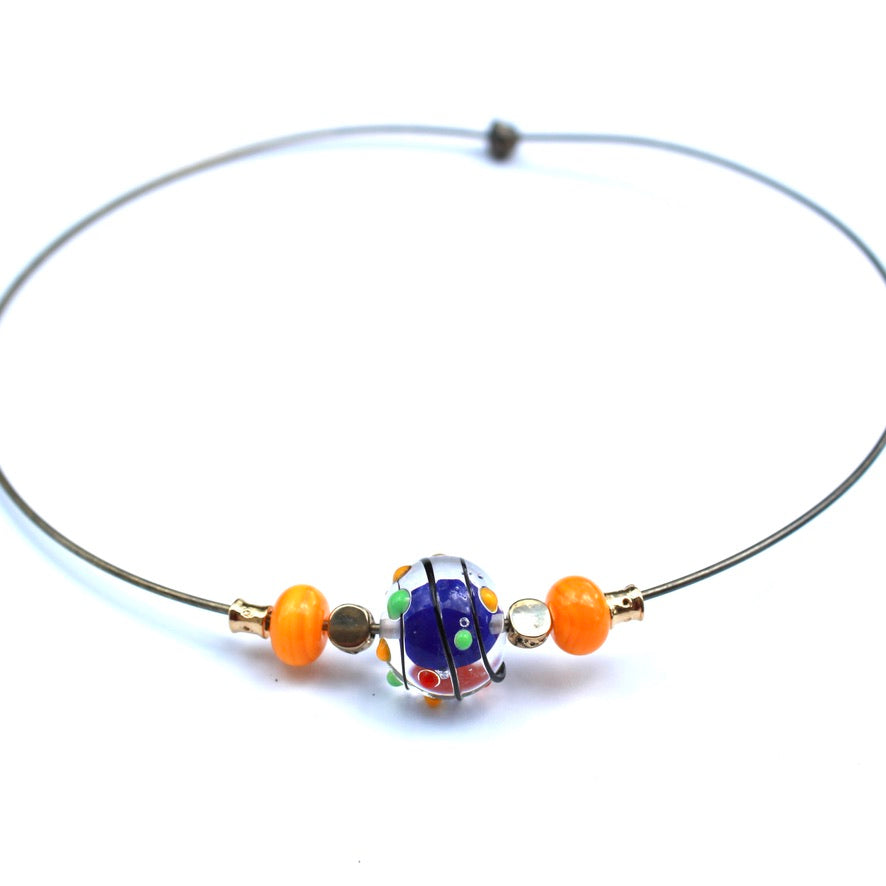 Collier en verre de Murano filé au chalumeau par Pasc@l le perlier d'art maison d'un un ras de cou semi-rigide en métal qui s'adaptera parfaitement et facilement à tous les tours de cou, en un clin d’œil joyeux.