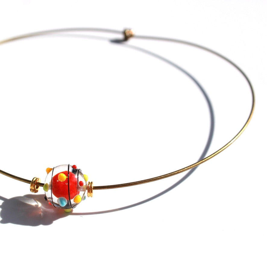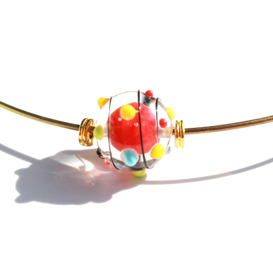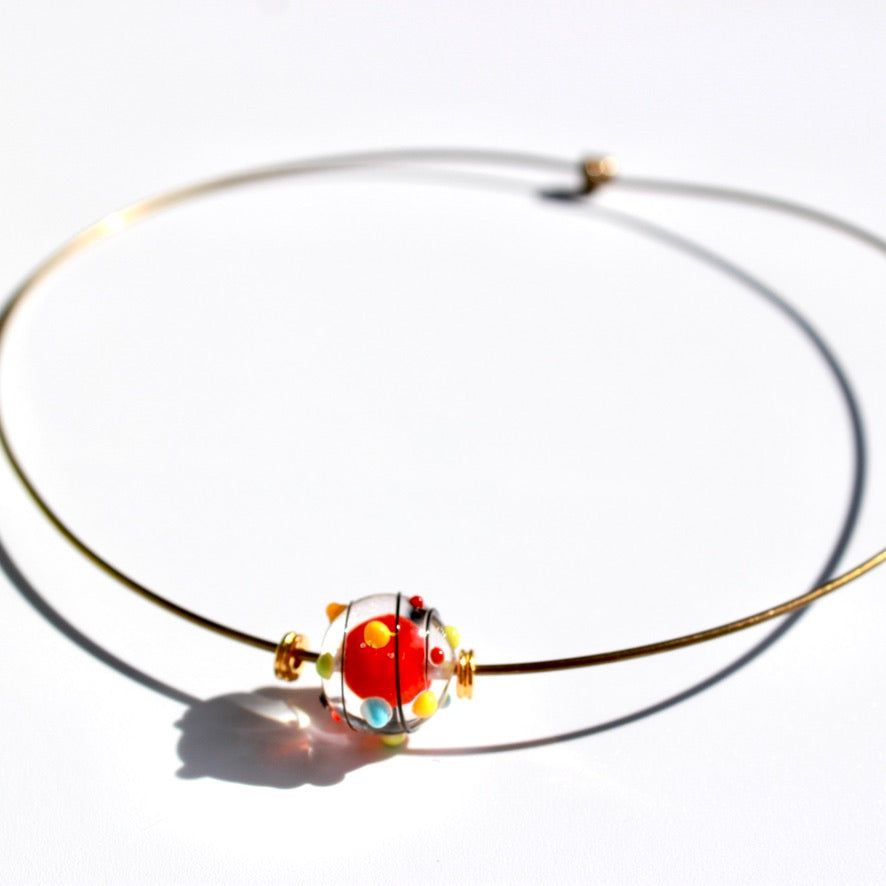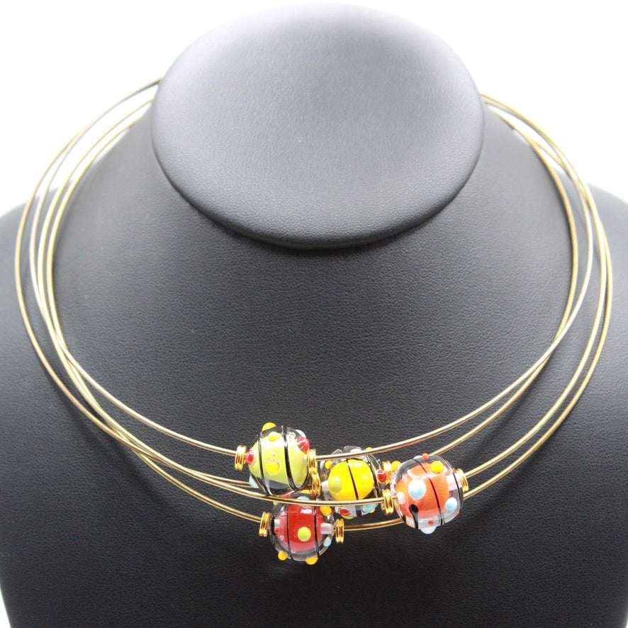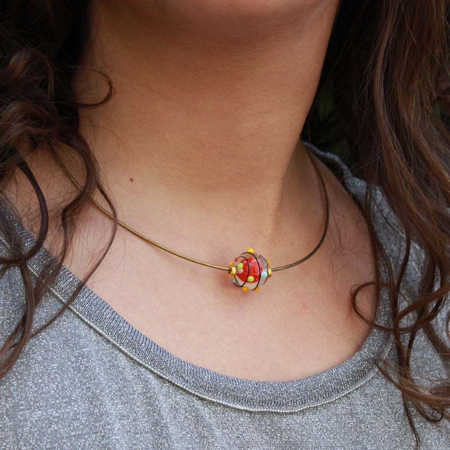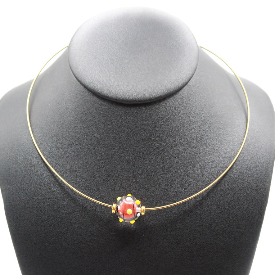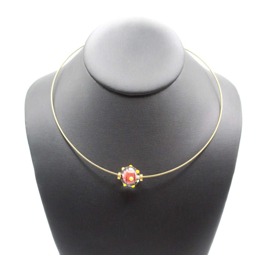 Collier en verre de Murano filé au chalumeau par Pasc@l le perlier d'art maison d'un un ras de cou semi-rigide en métal qui s'adaptera parfaitement et facilement à tous les tours de cou, en un clin d’œil joyeux.