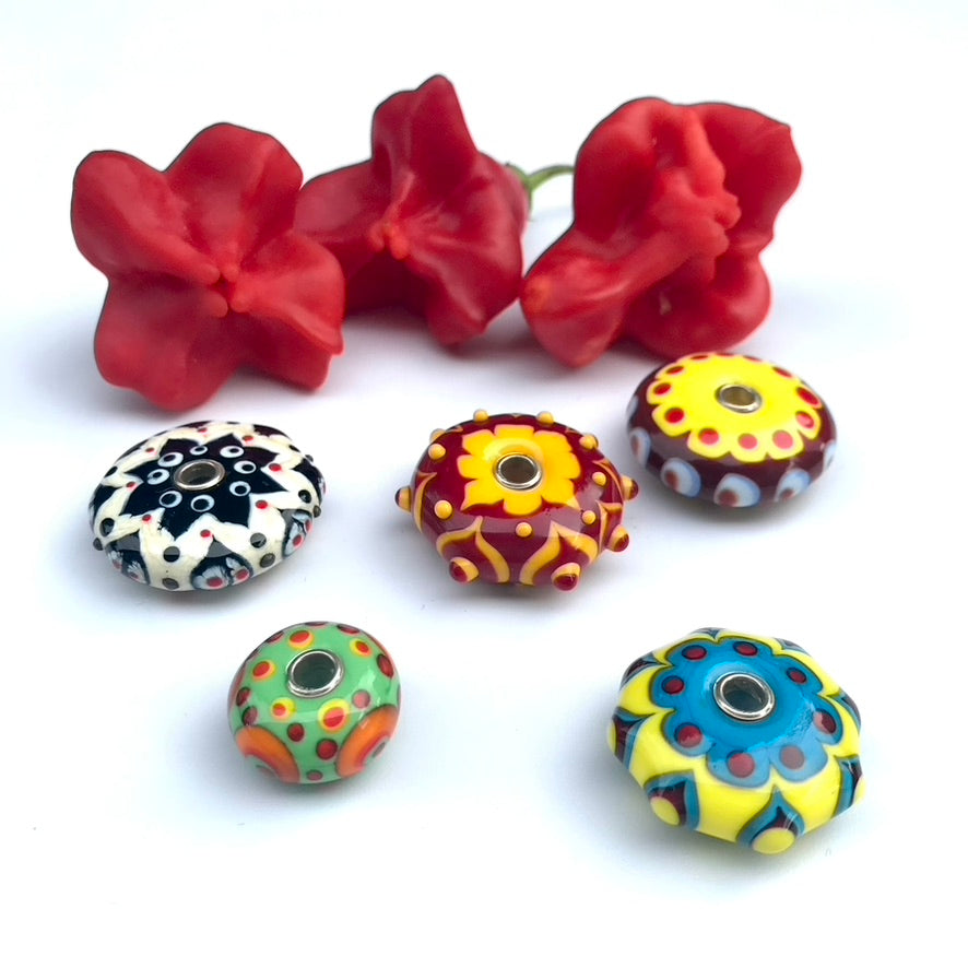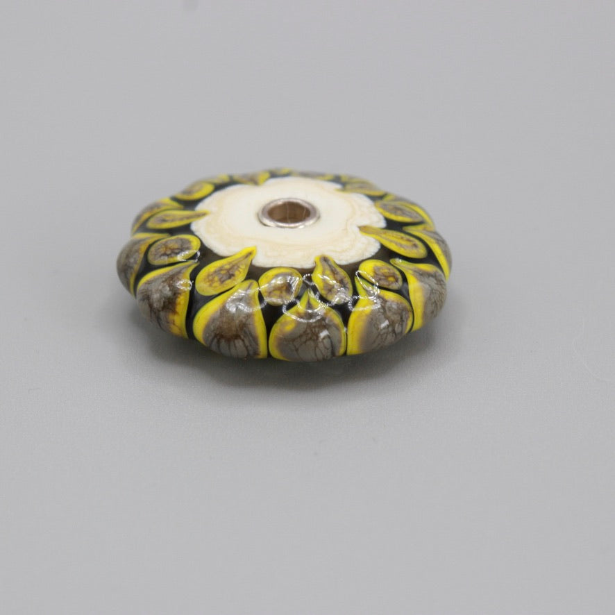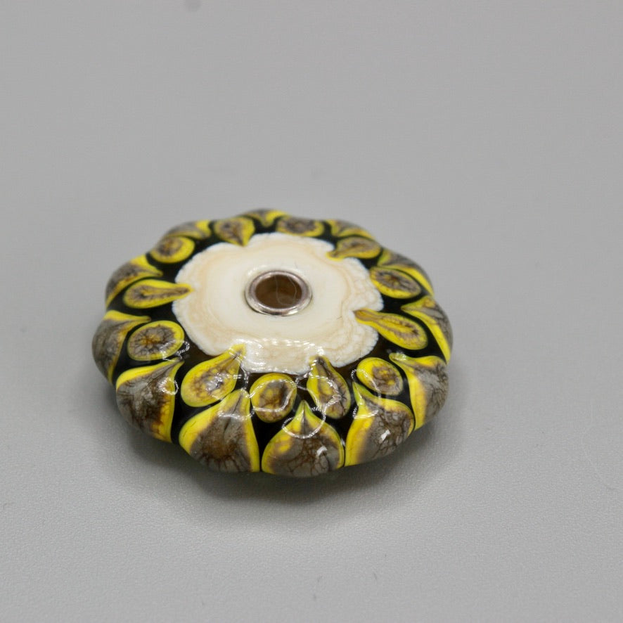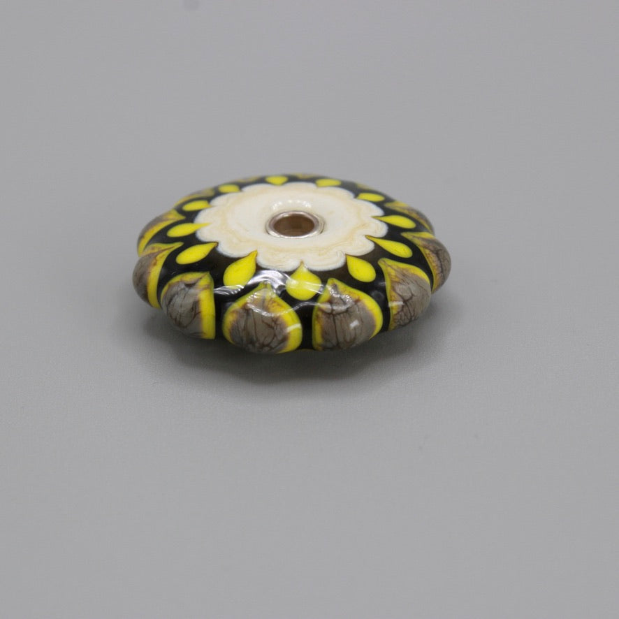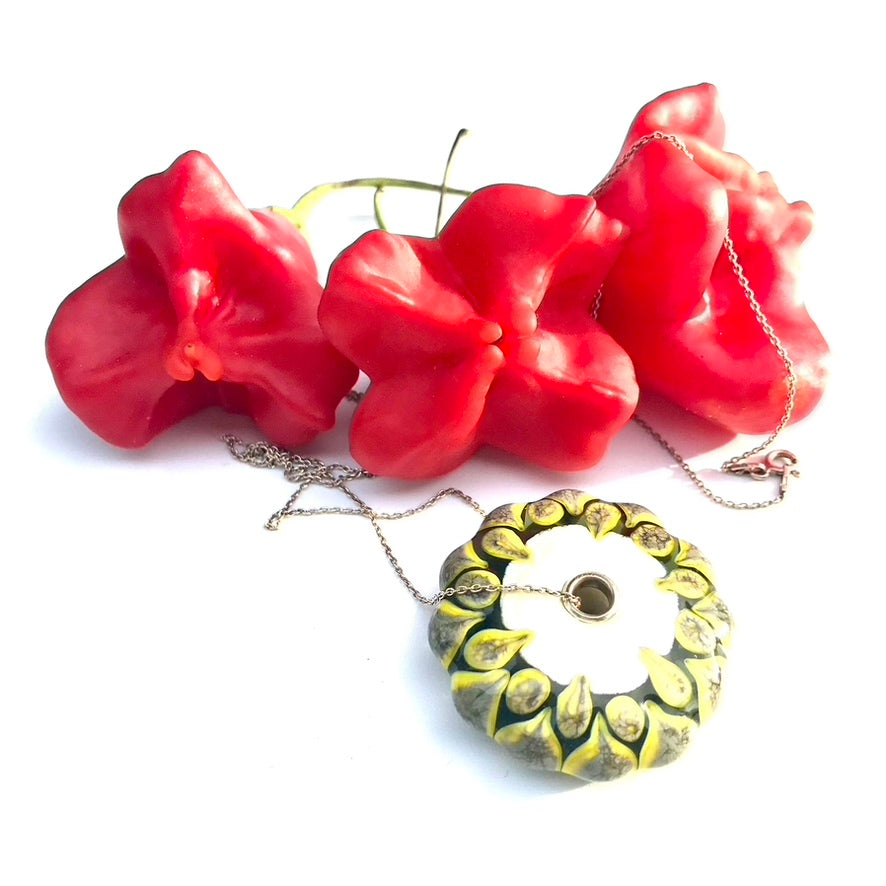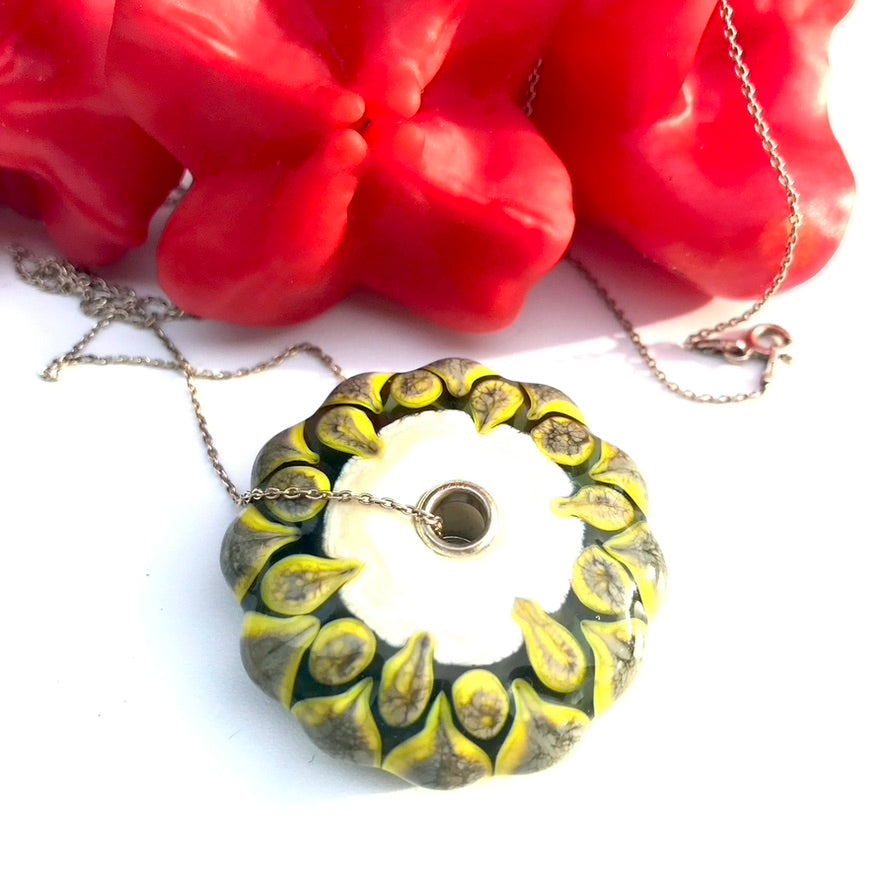 Pendentif forme lentille blanc ivoire saupoudrée d'une touche subtile de vert à points plats pour un motif graphique épuré surligné de noir, trouée en son centre et rehaussé par deux œillets en argent 925 pour une perle en verre de Murano ronde un peu, beaucoup, passionnément maison filé au chalumeau aux couleurs multicolores et chatoyantes différentes au recto et au verso