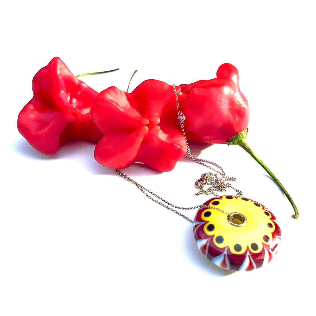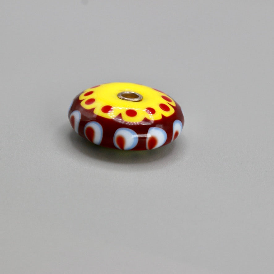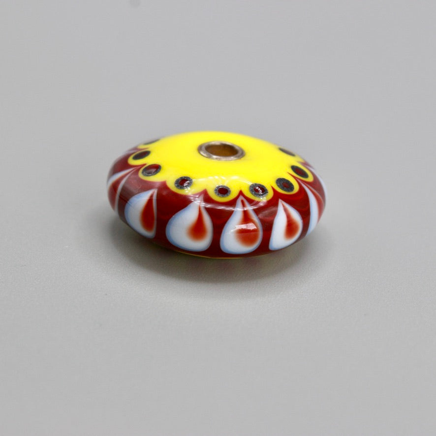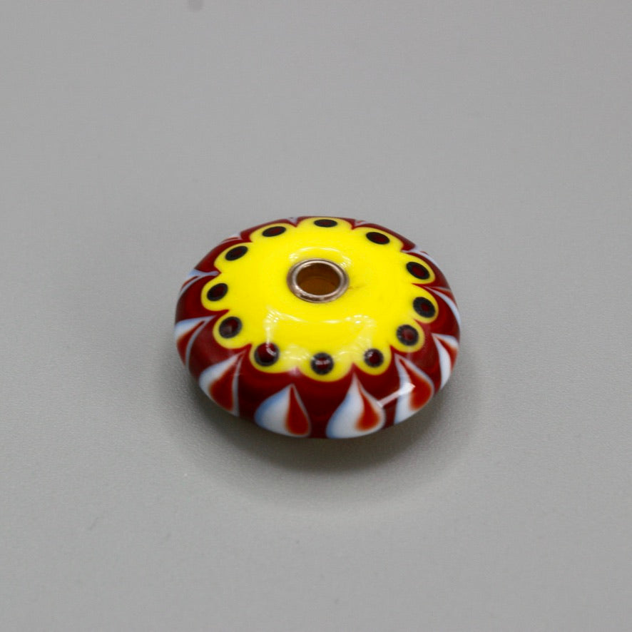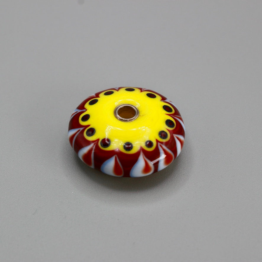 Pendentif forme lentille jaune saupoudrée d'une touche subtile de de blanc et rouge à points plats pour un motif graphique épuré, trouée en son centre et rehaussé par deux œillets en argent 925  pour une perle en verre de Murano ronde un peu, beaucoup, passionnément maison filé au chalumeau aux couleurs multicolores et chatoyantes différentes au recto et au verso