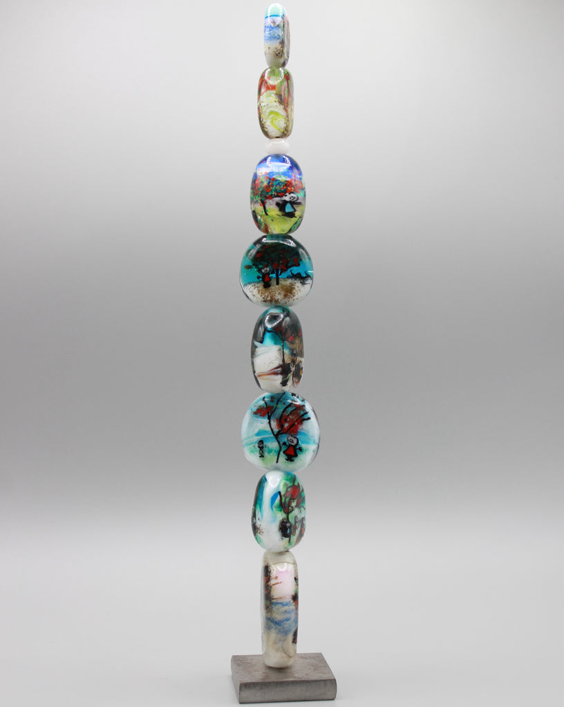Motif abstrait et personnages figuratifs enfantins sur mandrin de 30 cm de hauteur composé d'une farandole de perles troubadours en verre de Murano rehaussées d'émaux pour une promenade en forêt où les enfants sont à la fête telle une fantasia d'un monde enchanté qui défi les lois de la réalité dans un tourbillon les entraînant dans une danse virtuelle au milieu d'un lieu emblématique enchanté de faire partie de cette farandole boisée pour des perles en verre de Murano filé au chalumeau multicolores créées dans notre atelier dédié aux portes des célèbres forêts des Pyrénées.